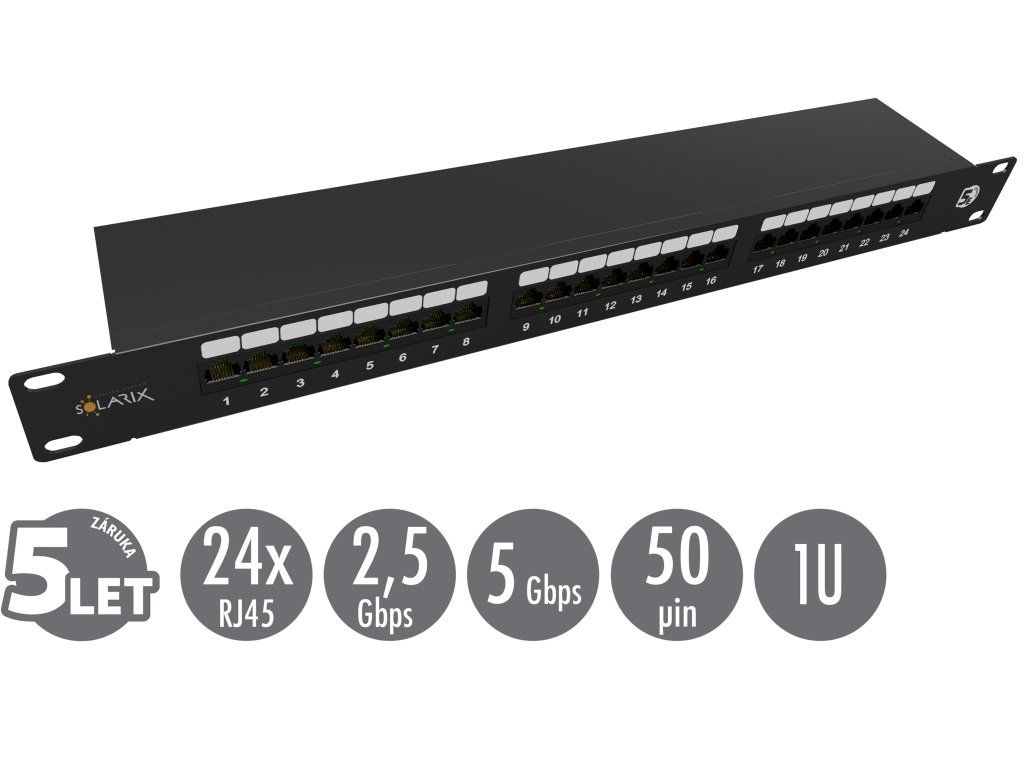 Stíněný patch panel Solarix – kategorie 5E s označením SX24-5E-STP-BK-N je dodáván v provedení s 24 porty RJ45. Panel je osazen moduly s duální IDC svorkovnicí 110/Krone. Svorkovnice je z důvodu snadného zakončení kabelu označena podle standardu T568A i T568B. Součástí těla panelu je vyvazovací lišta, která slouží k přehlednému uspořádání a pevnému uchycení datového kabelu. Stíněný patch panel Solarix SX24-5E-STP-BK-N splňuje požadavky na komponenty kategorie 5E a třídu vedení Class D, které jsou definovány ve standardech ANSI/TIA 568, ISO/IEC 11801 a EN 50173, a to včetně všech nejnovějších dodatků. Panel je pevný, spolehlivý a poskytuje dlouhou životnost. Standardní barva patch panelu je černá. Velikost v datovém rozvaděči je 1U. Součástí balení je 4x M6 montážní sada, a 24x vyvazovací pásek. Tento nový patch panel Solarix nahrazuje panel s označením SX24-5E-STP-BK. Technické parametry Kategorie: CAT5E Podporované protokoly: 2.5/5GBASE-T a nižší Počet portů: 24 Stínění: ano Vyvazovací lišta: ano Min. životnost portu: 1 000 zapojení/odpojení Krytí kontaktů: 50 µ zlata Svorkovnice: duální 110/Krone 8p8c Min. životnost svorkovnice: 200 zařezání Velikost a typ vodiče: AWG 26 - 22, drát Materiál nekovových částí: FR plast podle UL94-0 Barva: černá Velikost: 1U Výška: 44 mm Šířka: 484 mm Hloubka: 95 mm Skladovací teplota: -40 až 70 °C Provozní teplota: -10 až 60 °C Max. provozní vlhkost: 93 % Balení: 1 ks, kartónový obal Rozměry balení (výška x šířka x hloubka): 75 mm x 510 mm x 110 mm Přepravní balení: 10 ks, kartónový box Rozměry přepravního balení (výška x šířka x hloubka): 230 mm x 515 mm x 400 mm Montážní sada v balení: 4x M6Dodatočné parametre