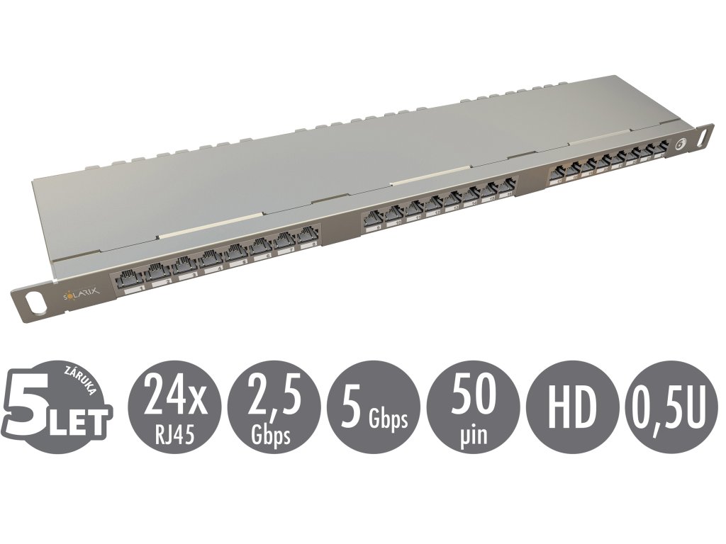 Patch panely Solarix s označením SX24HD-6-STP-SL jsou vysokohustotní 19'' patch panely s výškou 0,5U, které jsou osazeny 24 porty RJ45 a duální IDC svorkovnicí 110/Krone. U těchto panelů je důraz kladen na maximální úsporu místa v rozvaděči, kdy do výšky 1U lze jednoduše nainstalovat až 48 portů. Tyto high-density panely Solarix jsou dostupné ve stíněném i nestíněném provedení a bez problémů splňují požadavky definované v mezinárodních standardech ANSI/TIA 568, ISO/IEC 11801 a EN 50173 včetně všech nejnovějších dodatků pro kategorii 6 a třídu vedení Class E. Panely jsou navrhnuty tak, aby byly robustní, spolehlivé, poskytovaly maximální výkon a umožňovaly jednoduchou instalaci. Součástí těla těchto panelů je vyvazovací lišta, která umožňuje pevné uchycení a přehledné uspořádání datového kabelu. V případě stíněného provedení je tento panel vyroben z pozinkovaného plechu. Technické parametry Kategorie: CAT6 Podporované protokoly: 2.5/5GBASE-T a nižší Počet portů: 24 Stínění: ano Vyvazovací lišta: ano Min. životnost portu: 1 000 zapojení/odpojení Krytí kontaktů: 50 µ zlata a 100 µ niklu Svorkovnice: duální 110/Krone 8p8c Min. životnost svorkovnice: 200 zařezání Velikost a typ vodiče: AWG 26 - 22, drát Materiál nekovových částí: FR plast podle UL94-0 Barva: stříbrná Velikost: 0,5U Výška: 22 mm Šířka: 484 mm Hloubka: 100 mm Skladovací teplota: -40 až 70 °C Provozní teplota: -10 až 60 °C Max. provozní vlhkost: 93 % Balení: 1 ks, kartónový obal Rozměry balení (výška x šířka x hloubka): 35 mm x 540 mm x 125 mm Přepravní balení: 14 ks, kartónový box Rozměry přepravního balení (výška x šířka x hloubka): 240 mm x 550 mm x 270 mm Montážní sada v balení: 2x M6Dodatočné parametre