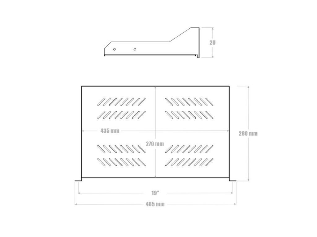 Polička s perforací 19'' 2U 280 mm - 19'' nízkoprofilová police 280 mm s uchycením 2U je vhodná pro umístění do 19'' datového rozvaděče s hloubkou 400 mm a hlubšší. - Perforované tělo police umožňuje proudění vzduchu. - Tato police se instaluje pouze na přední vertikální lišty datového rozvaděče. TECHNICKÉ VLASTNOSTI Celková hloubka police: 280 mm Výška uchycení v rozvaděči:: 2U Rozměr úložné plochy police: (š) 435 mm x (h) 270 mm Max. nosnost police: 20 kg Rozměry: (v) 100 mm x (š) 510 mm x (h) 300 mm Hmotnost: 1,64kg Součástí balení je příbal pro uchycení v rozvaděči: 4x klecová matice M6, 4x šroub M6Dodatočné parametre