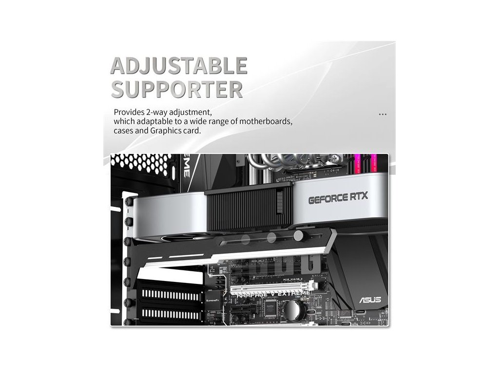 Štýlový variant držiaka grafickej karty je vyrobený z oceľového práškovo lakovaného plechu a plastu.Zabraňuje prehýbaniu väčších kariet v slote a dodáva tak zostave lepšiu celkovú stabilitu.