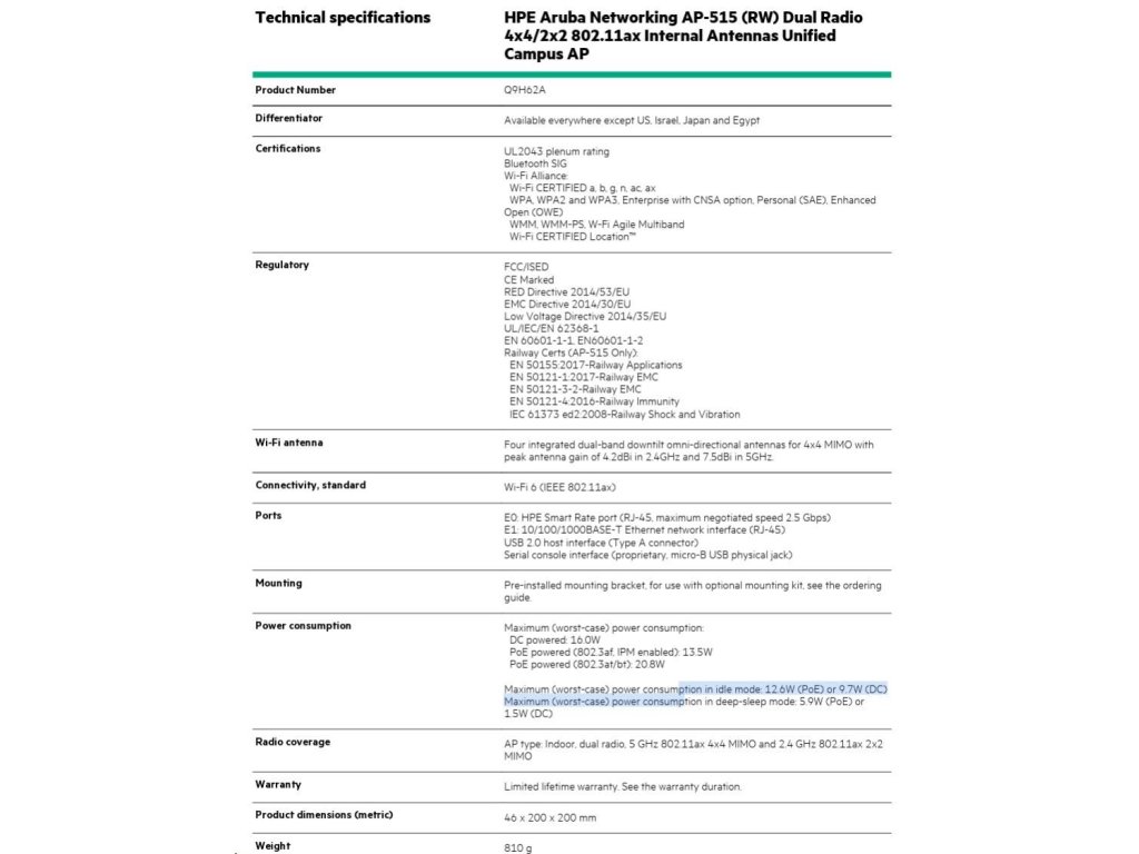 5 x HPE Aruba Networking AP-515 (RW) Dual Radio 4x4/2x2 802.11ax Internal Antennas Unified Campus AP ( 5 pack Q9H62A ) Q9H62A//5pack