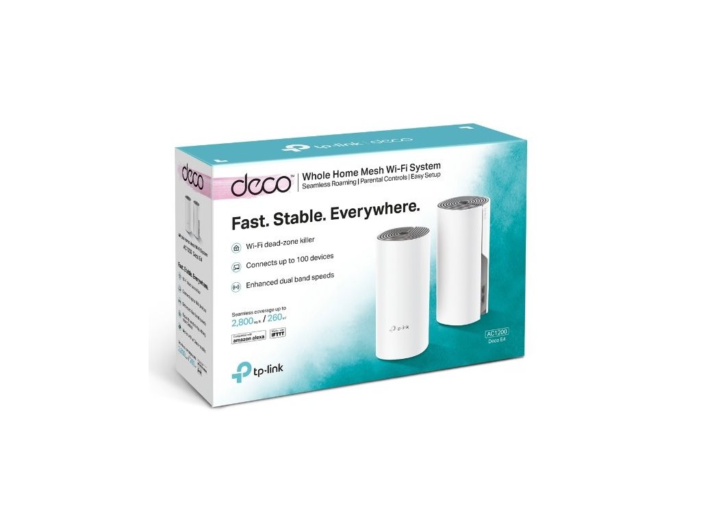 - Dvojbalení Deco E4 poskytuje Wi-Fi pokrytí na ploše až 2800 čtverečních stop (= 260 m2, verze EU). A pokud to nestačí, kdykoli k síti jednoduše přidejte další jednotku Deco, abyste zvýšili pokrytí.