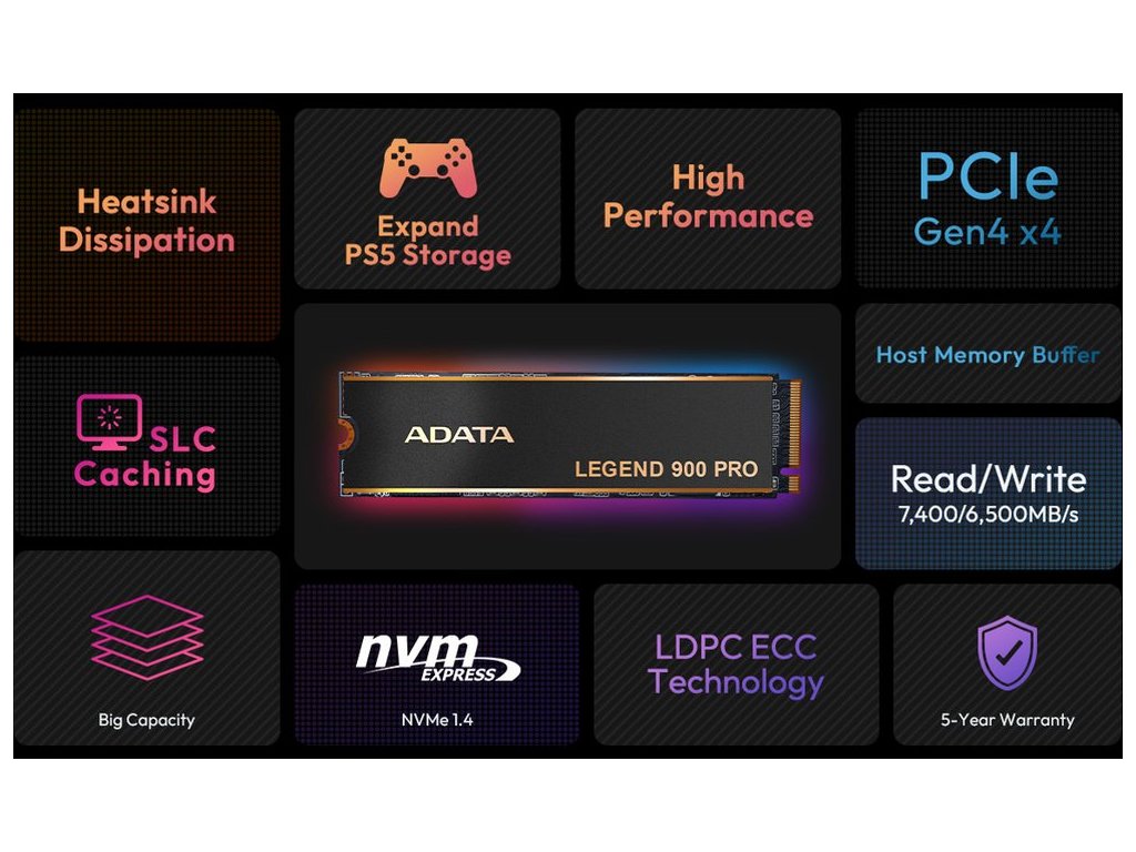 SSD ADATA LEGEND 900 PRO disponuje technologií HMB a mezipamětí SLC, což přispívá k optimalizaci procesů a hladkému provozu i při vysoké zátěži. Samozřejmostí je také technologie LDPC pro opravu případných chyb a spolehlivý přenos dat, respektive zabezpečení souborů. Díky softwaru SSD Toolbox můžete jednoduše monitorovat stav a provozní parametry disku, jako jsou teploty, kapacita úložiště apod.