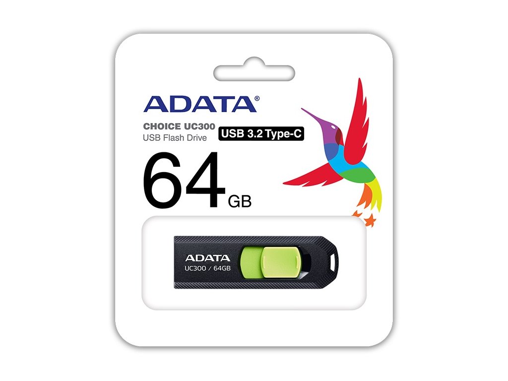 ADATA USB Flash Drive UC300 Rozhraní: USB 3.2 Gen1 s rychlostí 5Gb/s - typ C Kapacita: 64 GB Velikost: 63 x 20 x 10mm Barva: černá + zelenáDodatočné parametre