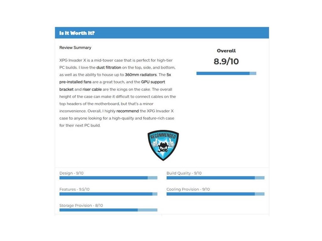 Model: ADATA INVADER X Podpora základních desek: *ATX *Micro-ATX *Mini-ITX Maximální výška chladiče CPU: 175 mm Maximální délka GPU: 400 mm Maximální délka PSU: 240 mm Počet šachet 2.5''/3.5'': 3x Čelní porty: *1x USB 3.2 Type-C *2x USB 3.2 Type-A *HD Audio Port Podpora chlazení: *Zadní ventilátor: 1x 120 / 140 mm *Horní ventilátor: 3x 120 mm, 2x 140 mm *Boční ventilátor: 3x 120 mm *Spodní ventilátor: 1x 120 / 140 mm *Zadní radiator: 120 mm *Horní radiator: 360 mm *Boční radiator: 360 mm Zdroj Bez zdroje Barva: Černá Rozměry: 245 x 448 x 475 mm (ŠxVxH) Hmotnost: 8.95 kg Záruka: 2 roky Recenze: https://tech4gamers.com/xpg-invader-x-pc-case-review/ Recenze: https://www.eteknix.com/xpg-invader-x-mid-tower-pc-case-review/ ''Společnost XPG čeká na trhu s skříněmi těžký boj, protože konkurence je silnější než kdykoli předtím a na trhu je nyní několik poněkud podobných produktů za podobné ceny. Přesto je XPG fantastickou značkou a zařazení dvou zadních desek, rozsáhlé možnosti vedení kabelů, podpora skrytých konektorů základních desek a celková podpora hardwaru z ní činí velmi atraktivní volbu pro ty, kteří chtějí prémiovou PC skříň, která bude v jejich herním prostoru vypadat úžasně.''Dodatočné parametre