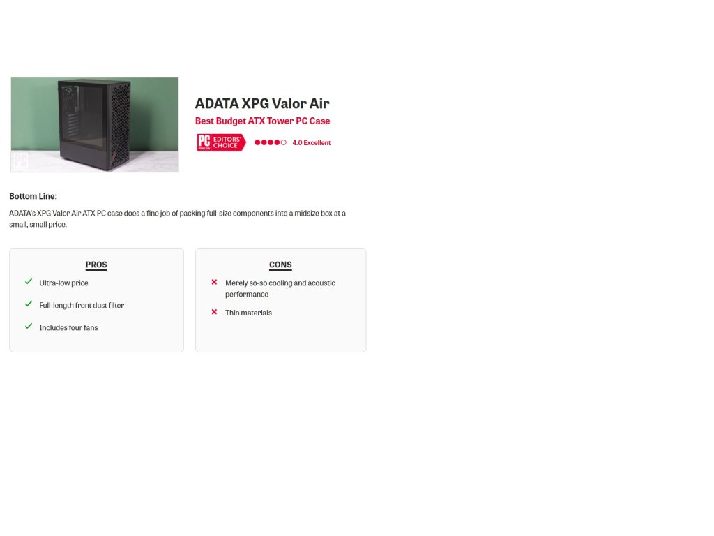 Model:ADATA XPG VALOR AIR Typ: Mid-Tower Barva: Černá Rozměry: 210 x 460 x 371 mm (ŠxVxH) Typ zdroje: Bez zdroje Podporuje základní desky:Mini-ITX, Micro-ATX, ATX Maximální velikost chladiče CPU: 166 mm Maximální délka VGA karty: 335 mm Externí vstupy a výstupy: *2x USB 3.2 *1x 3.5mm audio/mic combo jack Podporované chlazení : *Přední ventilátory: 3 x 120 mm , 2 x 140 mm *Horní ventilátory: 2 x 120 mm , 2 x 140 mm *Zadní ventilátory:1 x 120 mm *Přední radiátor:360 / 280 / 240 mm *Horní radiátor: 240 mm *Zadní radiátor:120 mm Stránka výrobce: https://www.xpg.com/en/xpg/pc-component-valor-air-compact-mid-tower-chassis?tab=description Ocenění: https://www.pcmag.com/picks/the-best-pc-tower-cases Recenze: https://www.techpowerup.com/review/xpg-valor-air/ Ocenění: The Best PC Tower Cases in 2024 | PCMaghttps://www.pcmag.com/picks/the-best-pc-tower-casesDodatočné parametre