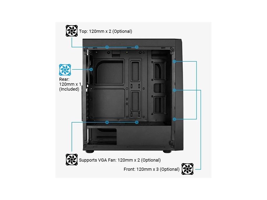 Vysoko výkonné šasi Midi Tower so štýlovým dizajnom RGB LED pásom na prednom paneli.Dodáva sa s bočným panelom z tvrdeného skla, ktorý predvádza vnútro vašej súpravy. Predný panel v štýle uhlíkových vlákien dodáva vašej zostave futuristický vzhľad.