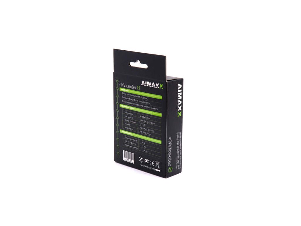 Spolehlivost, tichost a atraktivní svěží design – to jsou ventilátory AIMAXX. Všechny AIMAXX ventilátory jsou vybaveny unikátním Nanomaxx ložiskem. Toto AIMAXXem patentované ložisko je vyrobeno ze super tenkého ale extra trvanlivého materiálu a zaručuje vysokou životnost a velmi nízkou hlučnost, dosaženou malým třením. Celá série je balena v poutavém zeleno-černém balení s oknem pro snadnější prezentaci zákazníkům. Technická specifikace: Rozměry: 80 × 80 × 25 mm Rychlost ventilátoru: 1000-1600 ± 10% rpm Napětí: 12V DC Ložisko: Nanomaxx ložisko CFM: 16.5-23.8 Hlučnost: 9.8-12.6 dB/A Délka kabelu: 300 mm Obsah balení: 12/7V 3 pinový adapter, kovové šroubky, gumové podložkyDodatočné parametre
