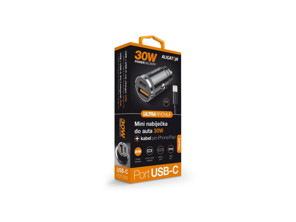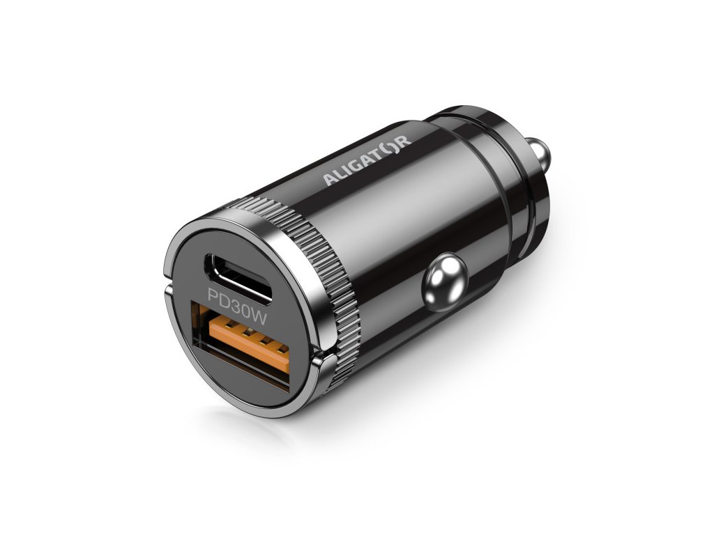 Výkonná a SMART Chytrá Mini nabíječka do auta ALIGATOR Power Delivery 30W, USB-C + USB-A, USB-C kabel pro iPhone/iPad Výkonná miniaturní nabíječka do auta řady „POWER DELIVERY“ v elegantním kovovém provedení s USB-A portem a ultra rychlým USB-C portem o výkonu 30W. Miniaturní rozměry, velký výkon Díky kompaktnímu zpracování je nabíječka elegantním doplňkem a zároveň kvalitním pomocníkem při dobíjení Vašich zařízení. Miniaturní rozměry zajišťují, že nabíječka krásně zapadne do cigaretového zapalovače ve Vašem automobilu a za pomoci zvedacích úchytek jej můžete snadno vytáhnout. Tato nabíječka je ideální pro dobíjení mobilních telefonů, tabletů a jiných zařízení. Chytrá nabíječka zvládne doplnit energii až dvěma přístrojům najednou, navíc je vybavena ultra rychlým USB-C portem s výkonem až 30W. Až 10x rychlejší oproti běžné USB nabíječce Power Delivery je technologie rychlého nabíjení, která uživateli poskytuje vyšší výkon a zkracuje dobu nabíjení pomocí konektoru USB-C. Technické parametry: • Vstup: DC 12-24V • Výstup: USB-C + USB-A: DC 5V – 3A • Power Delivery 30W • USB-C kabel pro iPhone/iPad součástí balení • Ochrana proti zkratu a přetíženíDodatočné parametre