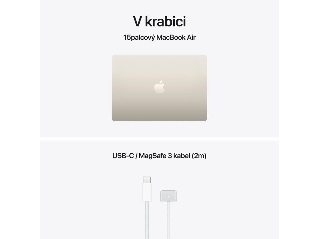 Apple MacBook Air 15'' s čipem M5 *Apple Intelligence Operační systém: macOS Procesor: Apple M5, 10jádrové CPU (4P+6E), 10jádrové GPU, 16jádrový Neural Engine, propustnost paměti 153 GB/s Paměť: 16GB Pevný disk: 1TB SSD Optická mechanika: ne Čtečka paměťových karet: ne Displej: 15,3'' Liquid Retina IPS, 2880×1864 při 224 pixelech na palec, LED podsvícení, 500 nitů, True Tone Audio: 6x reproduktor s wooferem, Dolby Atmos, 3x mikrofon Webkamera: 12Mpx Center Stage, 1080p HD video Polohovací zařízení: Force Touch trackpad Podsvícená klávesnice: ano Layout klávesnice: SK Numerická klávesnice: ne Čtečka otisků prstů: Touch ID Síť: ne Bezdrátová komunikace: Wi-Fi 7 (802.11be) + Bluetooth 6 Porty USB: *2x Thunderbolt/USB 4 (nabíjení, DisplayPort, Thunderbolt 4: až 40Gb/s, USB4: až 40Gb/s) Ostatní porty: *1x MagSafe 3 *1x 3,5mm sluchátkový konektor Baterie: vestavěná 66,5Wh lithium-polymerová Výdrž baterie: až 15 hodin bezdrátového prohlížení webu Napájení: napájecí adaptér se prodává zvlášť (minimální příkon potřebný k nabíjení zařízení je 140 W) Barva: ,hvězdně bílá Rozměry: 340,4x237,6x11,5mm Hmotnost: 1,51kg V krabici: *15'' MacBook Air *USB-C/MagSafe 3 kabel (2m) *SK návod součástí balení Záruka: 1 rokDodatočné parametre