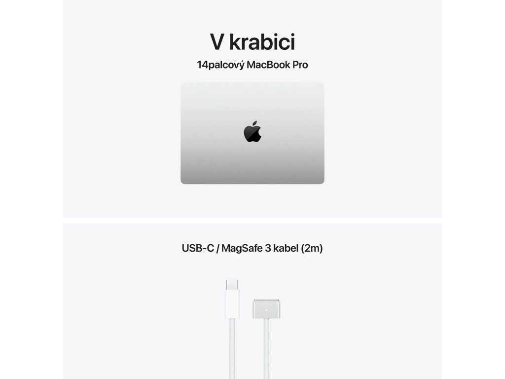 Apple MacBook Pro 14'' s čipem M5 Max *Apple Intelligence Operační systém: macOS Procesor: Apple M5 Max, 18jádrové CPU (6P+12E), 32jádrové GPU, 16jádrový Neural Engine, propustnost 460 GB/s Paměť: 36GB Pevný disk: 2TB SSD Optická mechanika: ne Čtečka paměťových karet: SDXC Displej: 14,2'' Liquid Retina XDR, 3024×1964 při 254 pixelech na palec, XDR až 1000 nitů, až 120Hz, True Tone Audio: Hi-fi zvuková soustava šesti reproduktorů s woofery v antirezonančním uspořádání, Dolby Atmos, soustava tří mikrofonů Webkamera: 12MP Center Stage, 1080p HD video, obrazový signálový procesor s výpočetním videem Polohovací zařízení: Force Touch trackpad Podsvícená klávesnice: ano, snímač okolního osvětlení Layout klávesnice: SK Numerická klávesnice: ne Čtečka otisků prstů: Touch ID Síť: ne Bezdrátová komunikace: Wi-Fi 7 (802.11be) + Bluetooth 6.0 Porty USB: *3× Thunderbolt 5 (nabíjení, DisplayPort, Thunderbolt 5: až 120 Gb/s, USB 4: až 120 Gb/s) Ostatní porty: *1× MagSafe 3 *1× 3,5mm sluchátkový konektor *1× HDMI *1× slot pro SDXC kartu Baterie: 72,4Wh lithium-polymerová Výdrž baterie: až 13 hodin bezdrátového prohlížení webu Napájení: napájecí adaptér se prodává zvlášť (minimální příkon potřebný k nabíjení zařízení je 70 W) Barva: stříbrná Rozměry: 312,6×221,2×15,5mm Hmotnost: 1,63kg V krabici: *14'' MacBook Pro *kabel USB-C/MagSafe 3 (2m) *slovenský ,návodDodatočné parametre