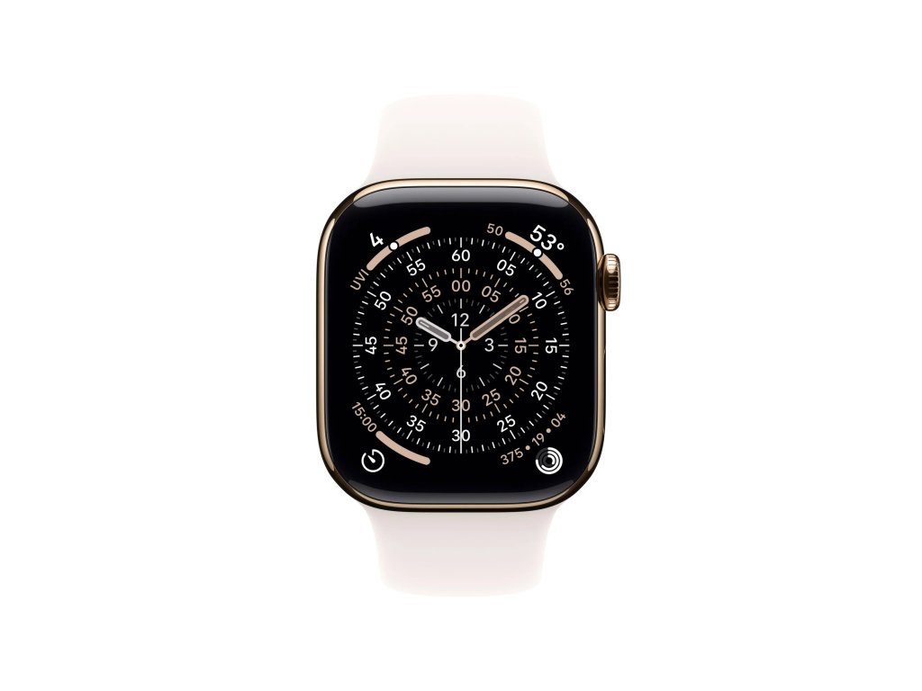Apple Watch Series 11 Cellular Sport Band zlaté/světleruměné M/L * pro zápěstí s obvodem 130–200 mm * korunka Digital Crown s haptickou odezvou * reproduktor/mikrofon Operační systém: watchOS Displej: stále zapnutý LTPO3 OLED Retina, 374×446 pixelů, 989mm2, 326 ppi, 1/2000 nitů Čip: * S10 s 64bitovým dvoujádrovým procesorem * 4jádrový Neural Engine * 64 GB Připojení: * GPS L1, GLONASS, Galileo, QZSS a BeiDou * LTE a UMTS * Wi-Fi 4 (802.11n) * podpora 2,4GHz a 5GHz Wi-Fi sítí * Bluetooth 5.3 * NFC: Apple Pay, GymKit Snímače: * elektrický snímač srdeční činnosti * třetí generace optického snímače srdeční činnosti * saturace kyslíkem * teploty * hloubkoměr do 6 m * teploty vody * kompas * stále aktivní výškoměr * akcelerometr snímající vysoké přetížení * gyroskop s vysokým dynamickým rozsahem * okolního osvětlení Voděodolnost: do 50 m (pro plavání) Odolnost proti prachu: IP6X Funkce: * aplikace Saturace kyslíkem * aplikace EKG * aplikace Sledování cyklu se zpětným odhadem doby ovulace * aplikace Srdeční tep * oznámení o vysoké a nízké tepové frekvenci * oznámení o nepravidelném srdečním rytmu * aplikace Léky * aplikace Všímavost se zaznamenáváním stavu mysli * aplikace Hluk * aplikace Spánek se sledováním fází spánku * spánkové skóre * upozorňování na spánkovou apnoi * oznámení o hypertenzi * tíseň SOS * mezinárodní tísňové volání * detekce autonehody * detekce pádu * monitorování hluku Kompatibilita: iPhone 11 a novější, včetně iPhonu SE (2. generace a novější) s iOS 26 nebo novějším Napájení: vestavěná dobíjecí lithium-iontová, podpora rychlonabíjení, až 24 hodin běžného používání Materiál pouzdra: titan Rozměry: 42x36x9,7mm Hmotnost: 34,6g Obsah balení: * Apple Watch Series 11 * řemínek * magnetická rychlonabíječka Apple Watch s USB-C kabelem (1m)Dodatočné parametre