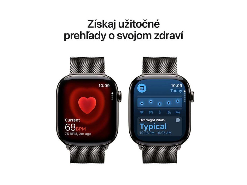 VIAC INFORMÁCIÍ O ZDRAVÍ— Kedykoľvek si urobte EKG. Dostávajte upozornenia na vysokú a nízku srdcovú frekvenciu, nepravidelný rytmus a možnú spánkovú apnoe. Pozrite si nočné zdravotné metriky pomocou aplikácie Vitals a odčítajte si hodnoty kyslíka v krvi.