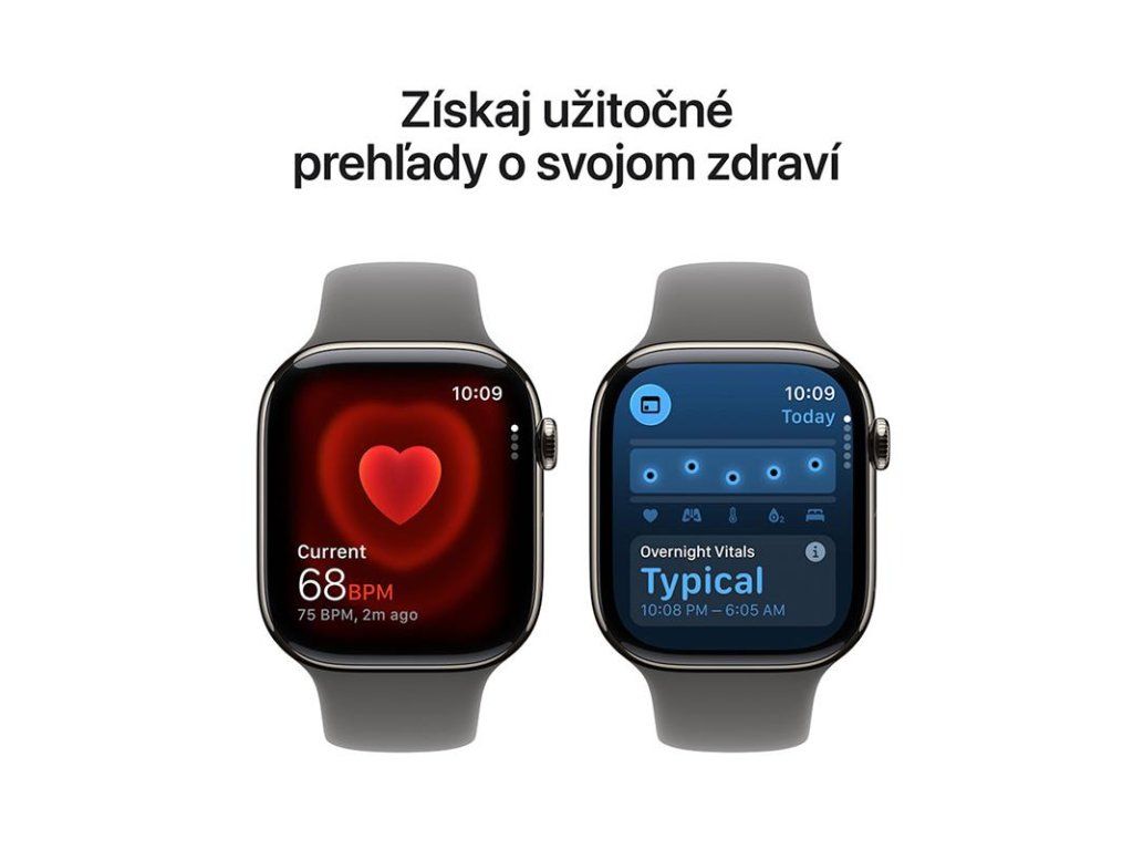 VIAC INFORMÁCIÍ O ZDRAVÍ— Kedykoľvek si urobte EKG. Dostávajte upozornenia na vysokú a nízku srdcovú frekvenciu, nepravidelný rytmus a možnú spánkovú apnoe. Pozrite si nočné zdravotné metriky pomocou aplikácie Vitals a odčítajte si hodnoty kyslíka v krvi.