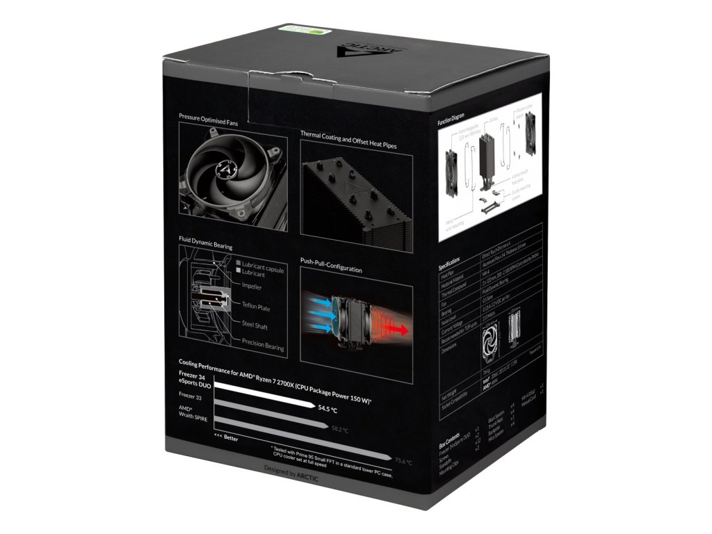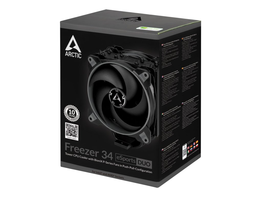 Freezer 34 eSports DUO - Věžový CPU chladič s ventilátorem BioniX P-Series v konfiguraci Push-Pull a vynikajícím poměrem cena / výkon. Se dvěma výkonnými, tlakově optimalizovanými ventilátory BioniX P a novoiu generací tepelného potažení chladiče nabízí Freezer 34 eSports DUO velkou výkonnost za přiměřenou cenu. Při zkouškách na úrovni 28 dB (A) dokázal Freezer 34 eSports DUO překonat mnoho konkurentů, dokonce i mnohem větší a dražší chladicí řešení s dvojitou věží. . Freezer 34 eSports DUO - Tower CPU Cooler with BioniX P-Series Fans in Push-Pull-Configuration Excellent Price-Performance Ratio With two powerful, pressure-optimised BioniX P-fans and its updated, thermal-coated heatsink, the Freezer 34 eSports DUO offers a lot of performance for a fair price. In internal tests levelled to 28 dB(A), the Freezer 34 eSports DUO was able to surpass many competitors, even much bigger and more expensive double tower cooling solutions. More information about our performance test and the max. CPU temperatures for AMD & Intel can be found in Cooler FAQ. New P-Fans for Increased Performance - The Freezer 34 eSports DUO benefits of all advantages of our new BioniX P-fans. High static pressure for increased cooling performance 0 db fan mode below 5 % PWM Extended RPM range Lower power consumption Fewer vibrations Extended life span High quality bearing PWM PST for synchronous fan control For additional information about the P-fans, we recommend our FAQ. Better Cooling - Better Performance No thermal throttling on your CPU - even at high turbo clock speeds and overclocking, the Freezer 34 eSports DUO cools quietly, so you can reach the maximum FPS with minimal noise levels for the smoothest possible gaming experience. Improved Heat Dissipation Evenly spread direct-touch heat pipes and an optimised heat sink design with 54 cooling fins lead to ideal heat dissipation for the Freezer 34 eSports DUO. Ideal airflow The two BioniX P-fans of the Freezer 34 eSports DUO work in push-pull-configuration The resulting increase of airflow ensures that more cold air is transported into the heatsink for cooling and the heat from the CPU is dissipated even faster from the heat sink. This ensures the best possible performance of the CPU. Thermal Coating A thermal coating creates micro-turbulences with a special surface structure. Combined with offset heat pipes this leads to an optimised heat-dissipation and to an increased cooling performance. High Performance for High-End CPU The contact surface of the Freezer 34 eSports DUO heat pipes does not cover the full heatspreader, but, more importantly, is right where the processor DIE is and covers even the largest versions (18 core) completely. MX-4 Thermal Paste Included The high-performance MX-4 thermal compound is included and ensures the best cooling results. Easy Installation & Secure Hold Fast and easy to install and extremely reliable, the Freezer 34 eSports DUO mounting system is compatible with Intel and AMD sockets. Thanks to a backplate and its low weight, the Freezer 34 eSports DUO is not only foolproof to install, but also absolutely transport safe. Optimal RAM Compatibility Thanks to its compact dimensions of only 124 x 157 x 103 mm, there are no restrictions when using RAM modules. Even RAM modules with larger heat sinks can be mounted without any issues and are not blocked by the CPU Cooler. Multilingual Manuals We offer a regularly updated user manual in many languages conveniently at your fingertips anywhere and anytime. Put the QR code sticker somewhere convenient and never waste time again looking for product instructions. Compatibility Intel Socket 1151 1150 1155 1156 2066 2011(-3) 1366 775 Yes Yes Yes Yes Yes* Yes* No No * SQUARE ILM (80 x 80 mm spacing) only AMD Socket sTR4 AM4 AM3(+) AM2(+) AM1 FM2(+) FM1 No Yes No No No No No Recommended for TDP up to: 210 W Information: Some motherboards are initially configured to allow CPU to automatically overclock. In such case, the CPU will be using more power than the announced TDP (see C’t issue 17/2017). Heatsink Direct Touch O 6 mm x 4 Aluminium Fins x 54, Thickness: 0.4 mm Thermal Coating Fan Thermal Compund: MX-4 Fan: 2 x 120 mm, 200 - 2 100 RPM (Controlled by PWM), 0 db fan mode below 5 % PWM Lager: Fluid Dynamic Bearing Geräuschpegel: 0.5 Sone Strom / Spannung: 0.13 A / 12 V DC per FanDodatočné parametre