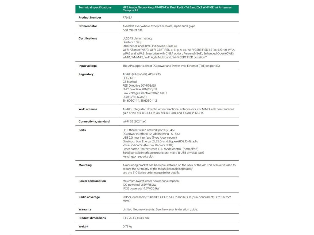 Aruba AP-615 (RW) Dual-radio Tri-band 2x2:2 802.11ax Wi-Fi 6E Internal Antennas Campus AP R7J49A