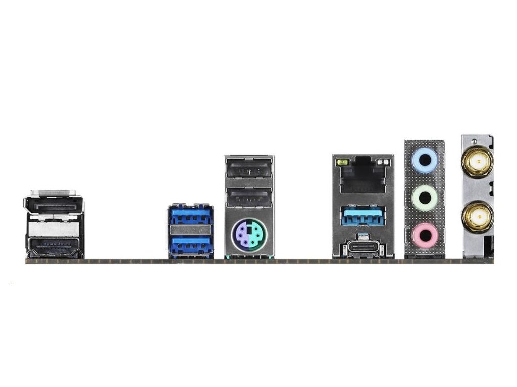 | Vstupy/výstupy na zadnom paneli | - 2 x porty antény - 1 x port myši/klávesnice PS/2 - 1 x port HDMI - 1 x port DisplayPort 1.4 - 2 x USB 2.0 Porty (podporuje ochranu proti ESD) - 3 x USB 3.2 porty typu A Gen1 (podporuje ochranu proti prepätiu) - 1 x USB 3.2 porty typu C Gen1 (podporuje ochranu proti ESD) - 1 x port RJ-45 LAN s LED diódou (ACT/LINK LED a SPEED LED) - HD audio konektory: Line in / predný reproduktor / mikrofón |