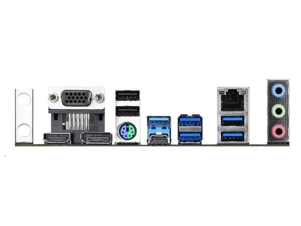 | Vstupy/výstupy na zadnom paneli | - Držiak antény - 1 x port PS/2 pre myš/klávesnicu - 1 x port D-Sub - 1 x port HDMI - 1 x DisplayPort 1.4 - 1 x USB 3.2 port typu A Gen2 (10 Gb/s) (podporuje ochranu proti prepätiu) - 1 x USB 3.2 Gen2 port typu C (10 Gb/s) (podporuje ochranu proti ESD) - 4 x USB 3.2 porty Gen1 (rozbočovač ASMedia ASM1074) (podporuje ochranu proti prepätiu) - 2 x USB 2.0 portov (podporuje ochranu proti ESD) - 1 x RJ-45 LAN port s LED diódou (ACT/LINK LED a SPEED LED) - HD audio konektory: Line in / Front Speaker / Microphone |