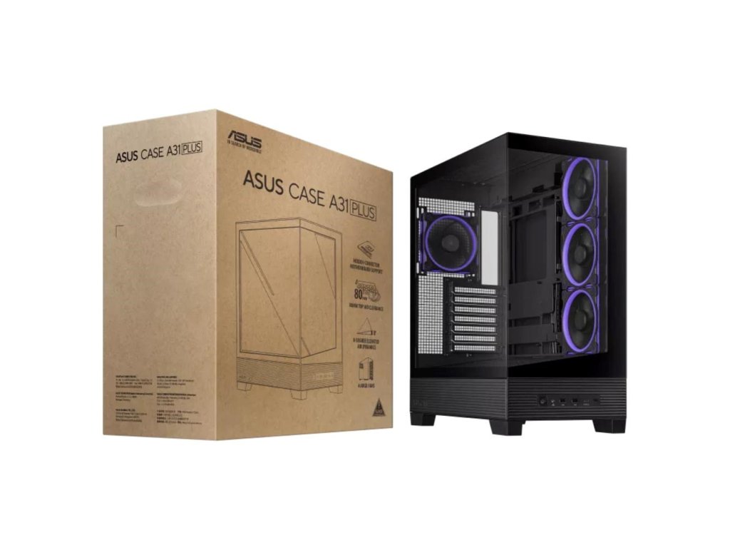 Skriňa ASUS A31 PLUS ATX ponúka podporu základných dosiek so skrytými konektormi, 360mm chladiča a 380mm grafickej karty, čierne alebo biele farebné prevedenie, štyri predinštalované ventilátory ARGB a čistý management káblov.