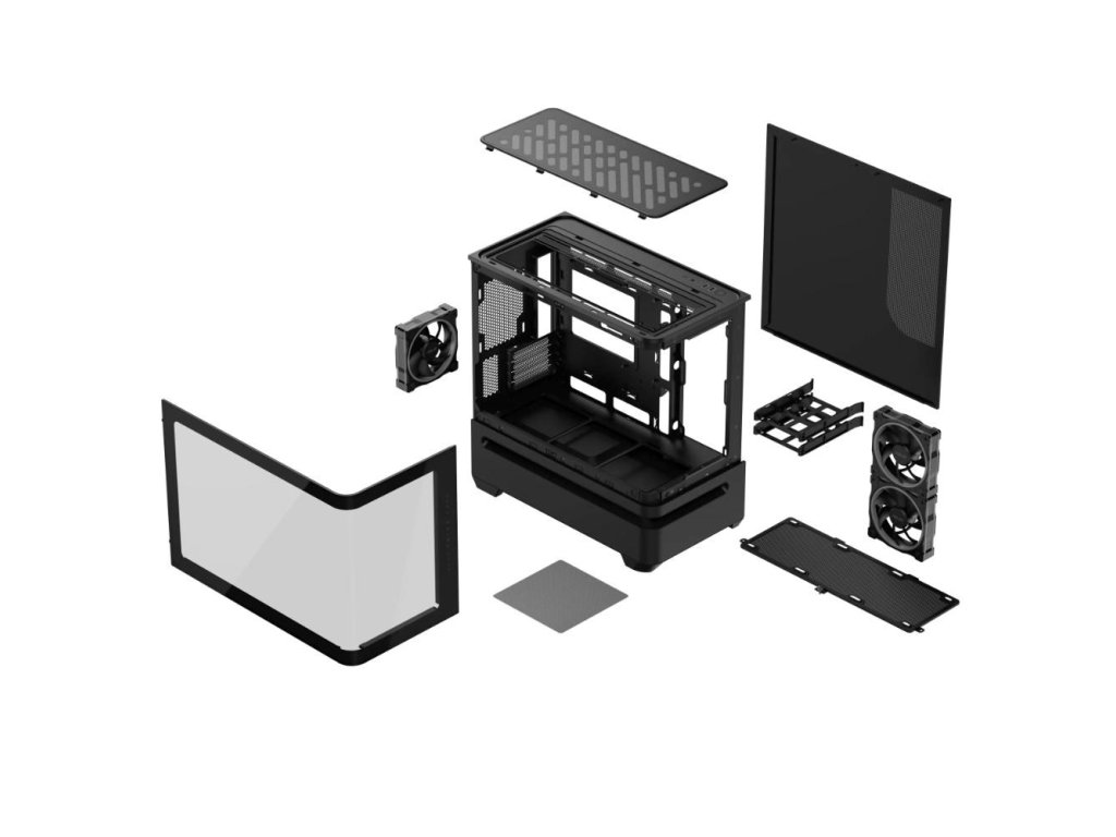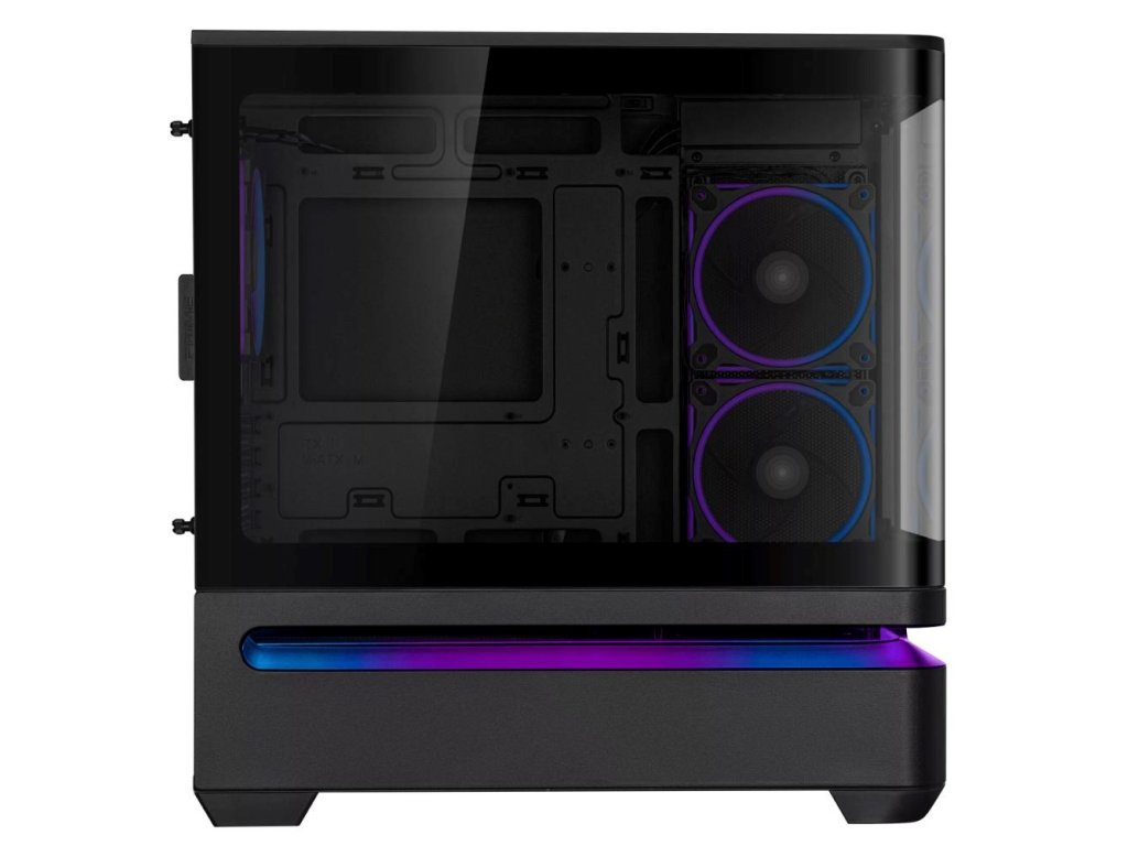 - Zakrivené tvrzené sklo plynulo prechádza z prednej strany na bočnú a ponúka panoramatický výhľad na komponenty z takmer každého uhla.