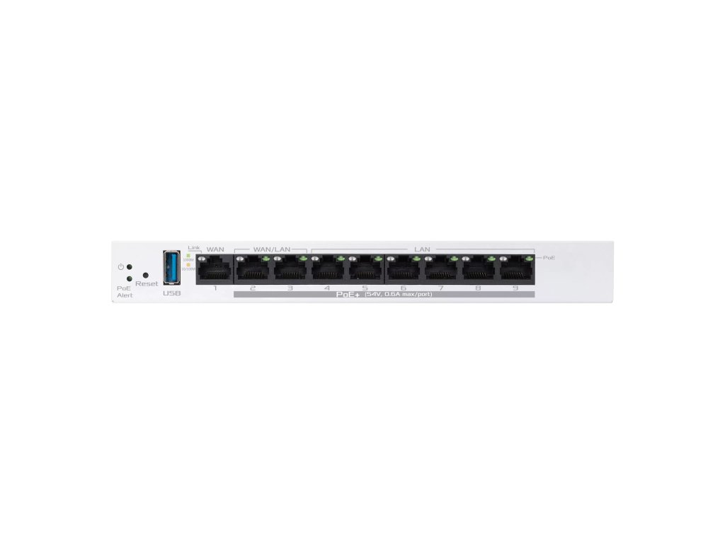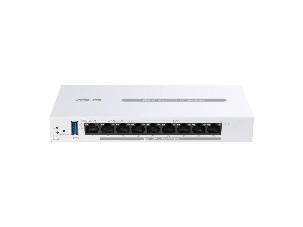 ASUS ExpertWifi EBG19P, VPN ROUTER Model: EBG19P Procesor: 1,8 GHz dvoujádrový ARMv8 Flash paměť: 256 MB RAM: 512 MB Anténa: 1× interní Bluetooth WAN porty: 1× Gigabit LAN porty: 8× Gigabit (2 lze přepnout na WAN) USB: 1× USB 3.2 Gen 1 Tlačítko: Reset LED: Power, PoE Alert Napájení vstup: 110–240 V AC, 50–60 Hz Napájení výstup: 54 V DC, max 2,278 A Rozměry: 212 × 95 × 26 mm Váha: 530 g Síťové standardy: IEEE 802.1p, 802.1q, 802.3, 802.3ab, 802.3i, 802.3u, 802.3x, IPv4, IPv6 Režimy: AiMesh Node, AiMesh Router Funkce: Firewall, VPN, QoS, blokování webů a aplikací, časové schéma, Guest síť, IoT síť, VPN síť Odkaz na oficiální web: https://www.asus.com/networking-iot-servers/business-network-solutions/asus-expertwifi/asus-expertwifi-ebg19p/Dodatočné parametre