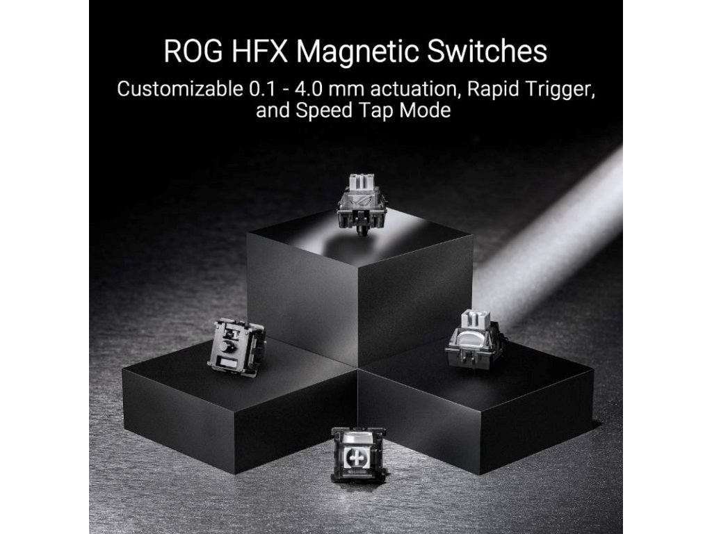 - Magnetické spínače ROG HFX: Má nastaviteľné ovládanie 0,1 - 4,0 mm pre okamžitý stlač klávesov