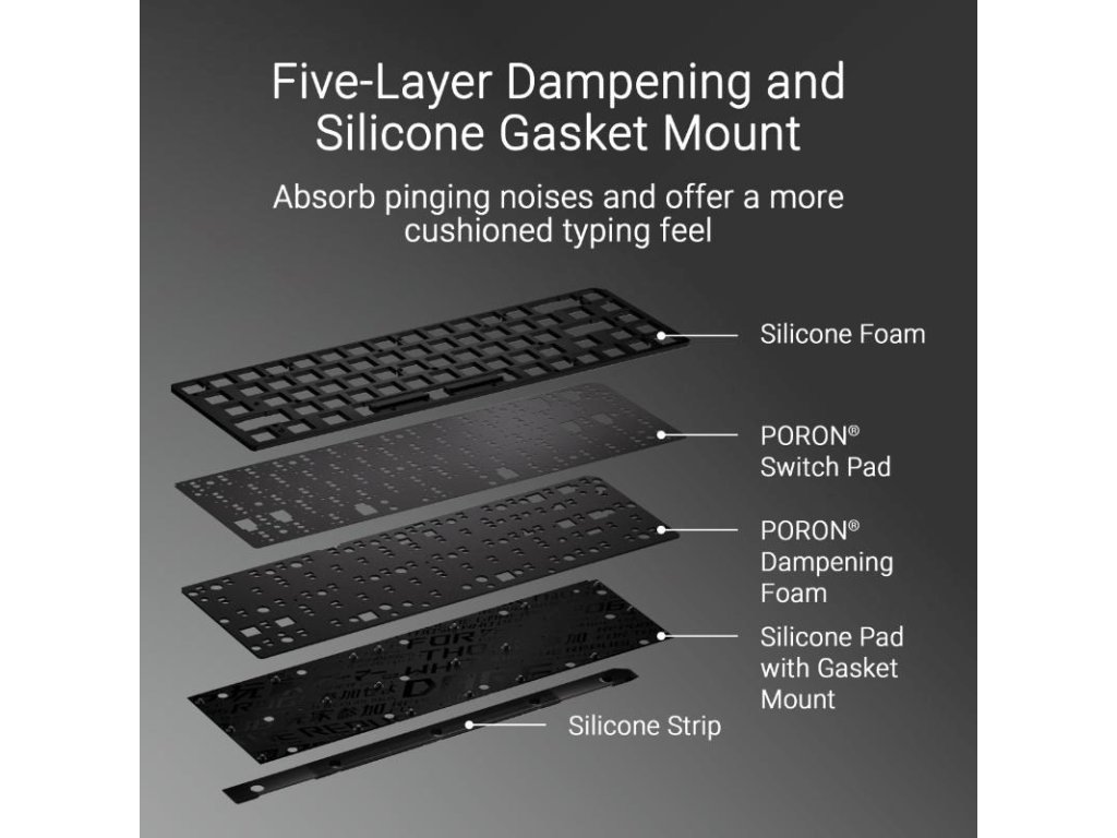 - Vylepšené možnosti písania: Integrované päťvrstvové tlmenie a silikónové tesnenie pohlcujú zvuky cinkania a ponúkajú tlmenejší pocit pri písaní