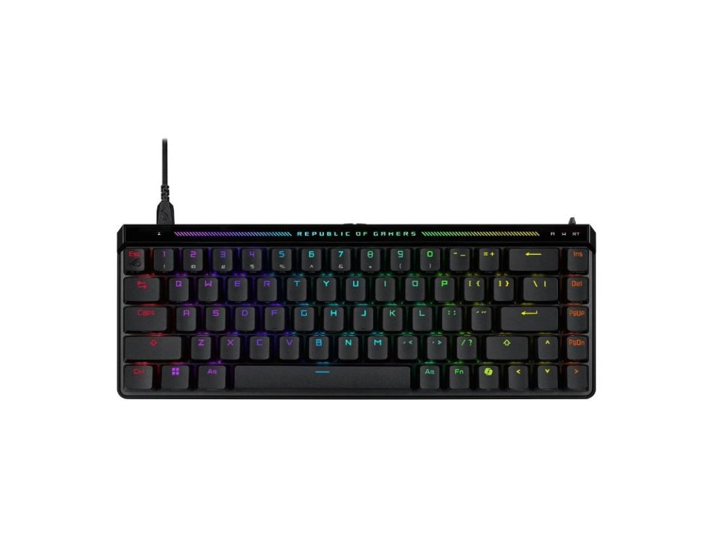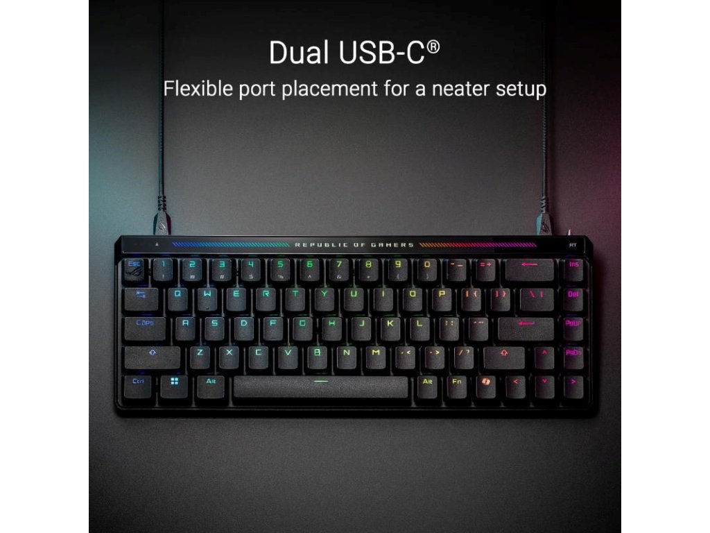 ROG Falchion Ace HFX 65% analógová herná klávesnica s magnetickými spínačmi ROG HFX, prepínač Rapid Trigger, režim Speed ??Tap, interaktívny dotykový panel, obnovovacia frekvencia 8000 Hz, päťvrstvové tlmenie a silikónové tesnenie, duálne porty Type-C, tri uhly sklonu a krycie puzdro