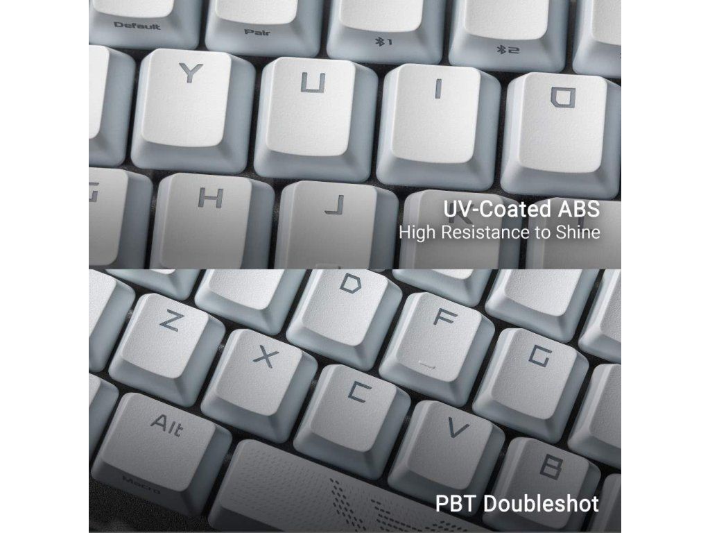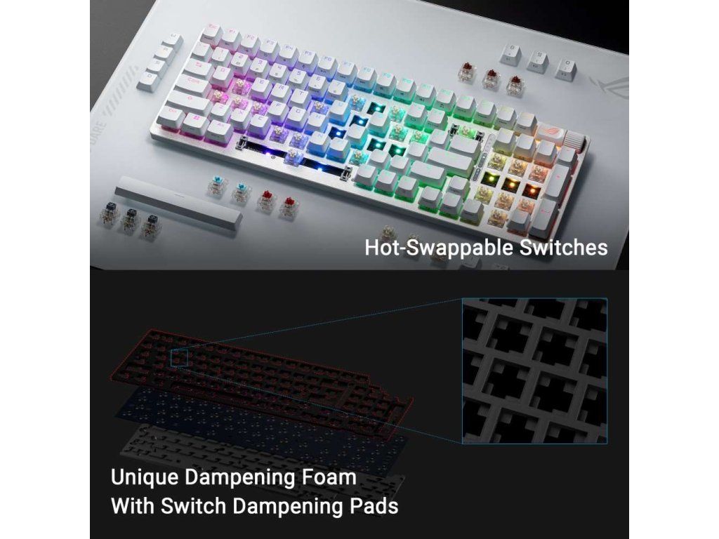 - Vylepšené možnosti písania: Predom namazané stabilizátory klávesnice produkujú menej trenia pre plynulejšie stlačenie kláves a stabilitu pre dlhšie klávesy; odolné krytky kláves ROG PBT doubleshot alebo krytky kláves ABS s UV vrstvou poskytujú prvotriedny pocit a odolnosť proti lesku