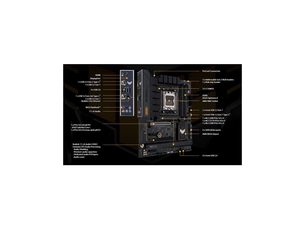 ASUS TUF GAMING B650-PLUS preberá všetky základné prvky najnovších procesorov AMD Ryzen série 7000 a kombinuje ich s funkciami pripravenými na hru a overenou odolnosťou.Táto základná doska, navrhnutá s komponentmi vojenskej kvality, vylepšeným riešením napájania a komplexným chladiacim systémom, presahuje očakávania so skalopevným a stabilným výkonom pre maratónske hranie.