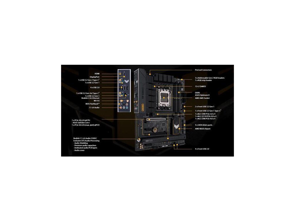 ASUS TUF GAMING B650-PLUS WIFI využíva všetky základné prvky najnovšej zásuvky AM5 pre stolné procesory AMD Ryzen™ a kombinuje ich s funkciami pripravenými na hry a overenou odolnosťou.Táto základná doska, navrhnutá s komponentmi vojenskej kvality, vylepšeným riešením napájania a komplexným chladiacim systémom, presahuje očakávania so skalopevným a stabilným výkonom pre maratónske hranie.