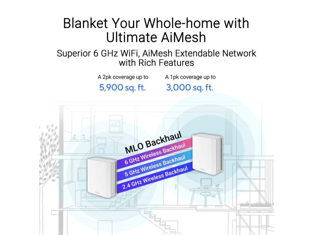 - Inteligentná sieť AiMesh poháňaná umelou inteligenciou zvyšuje pokrytie až na 5900 štvorcových stôp (2 balenia) a jednoduchú rozšíriteľnosť pomocou kompatibilných routerov ASUS pre bezproblémové a bezpečné WiFi v celej domácnosti