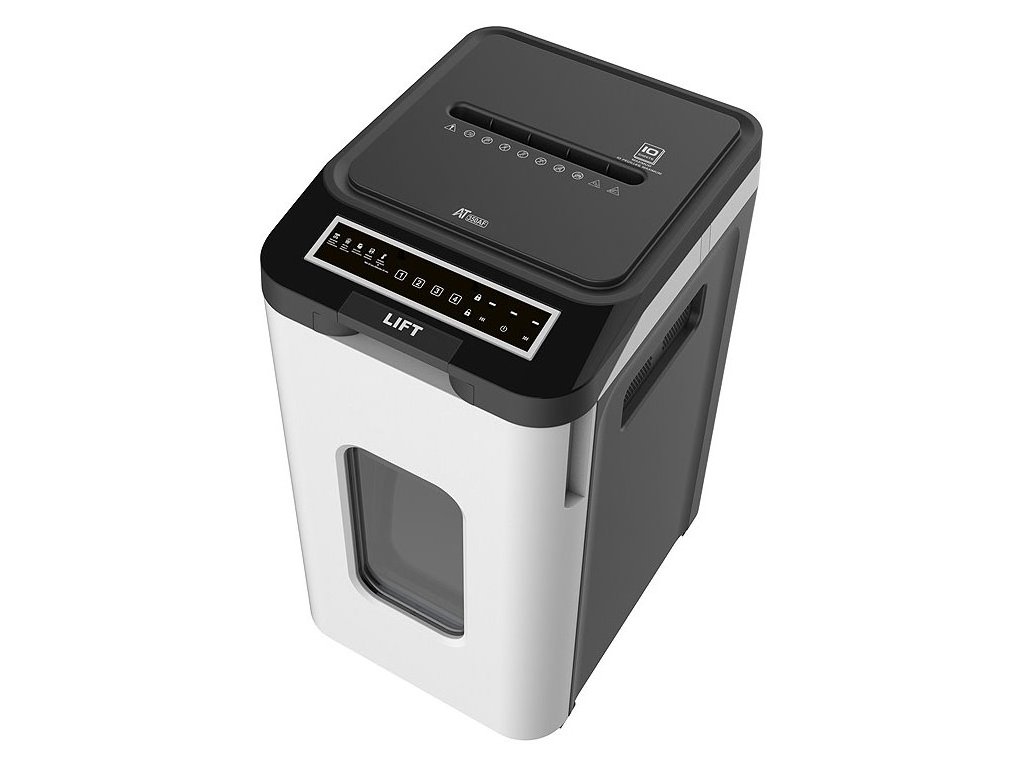 AT skartovačka AT-350AFKvalitní skartovací stroj s automatickým podavačem umožňuje postupné skartování až 350 listů. Možná je i přímá skartace až 11 listů. Je vhodný pro skartaci dokumentů o šířce až 240 mm. Stroj je standardně vybaven automatickým systémem start/stop hlídaným foto buňkou, LED displejem, zpětným chodem a pohotovostním režimem proti přetížení stroje. Příležitostně lze skartovat sešívací svorky, sponky, CD i kreditní karty. Lehce vyprázdnitelná odpadní nádoba má objem 53 l. Praktická pojezdová kolečka usnadňují manipulaci.