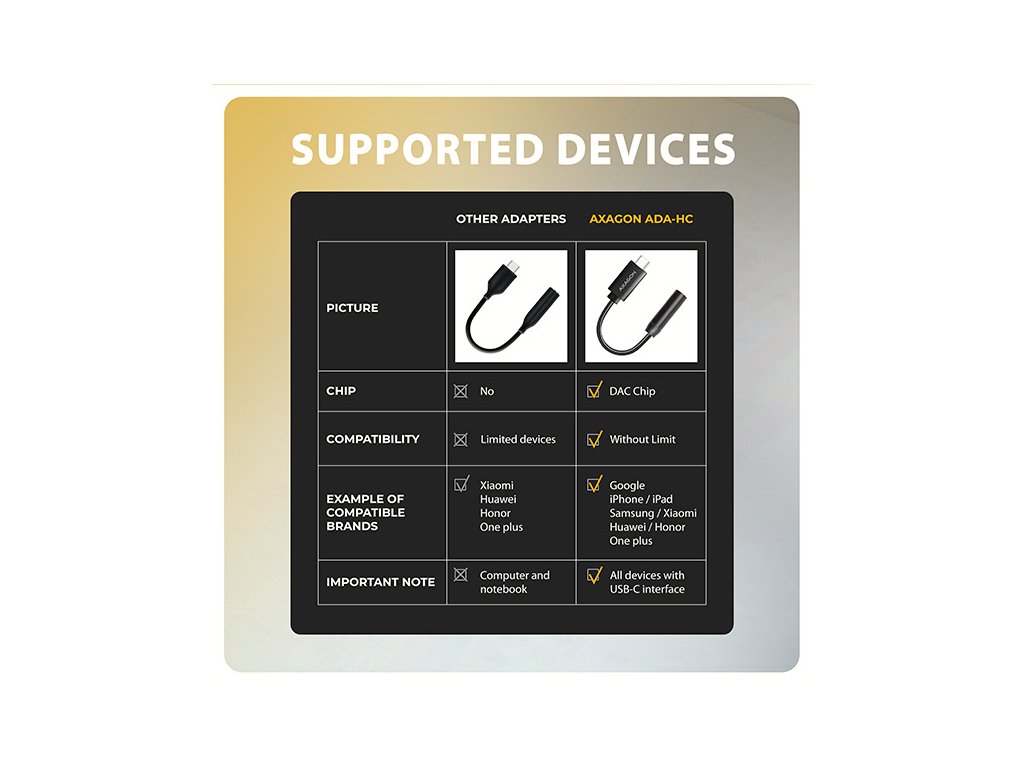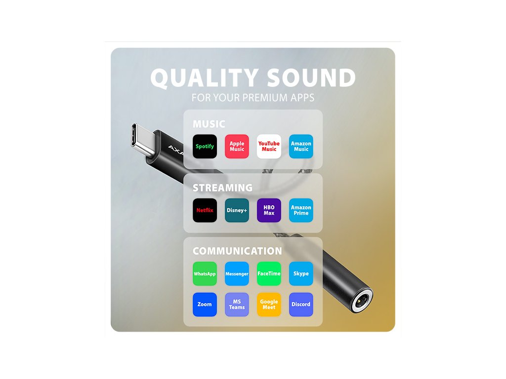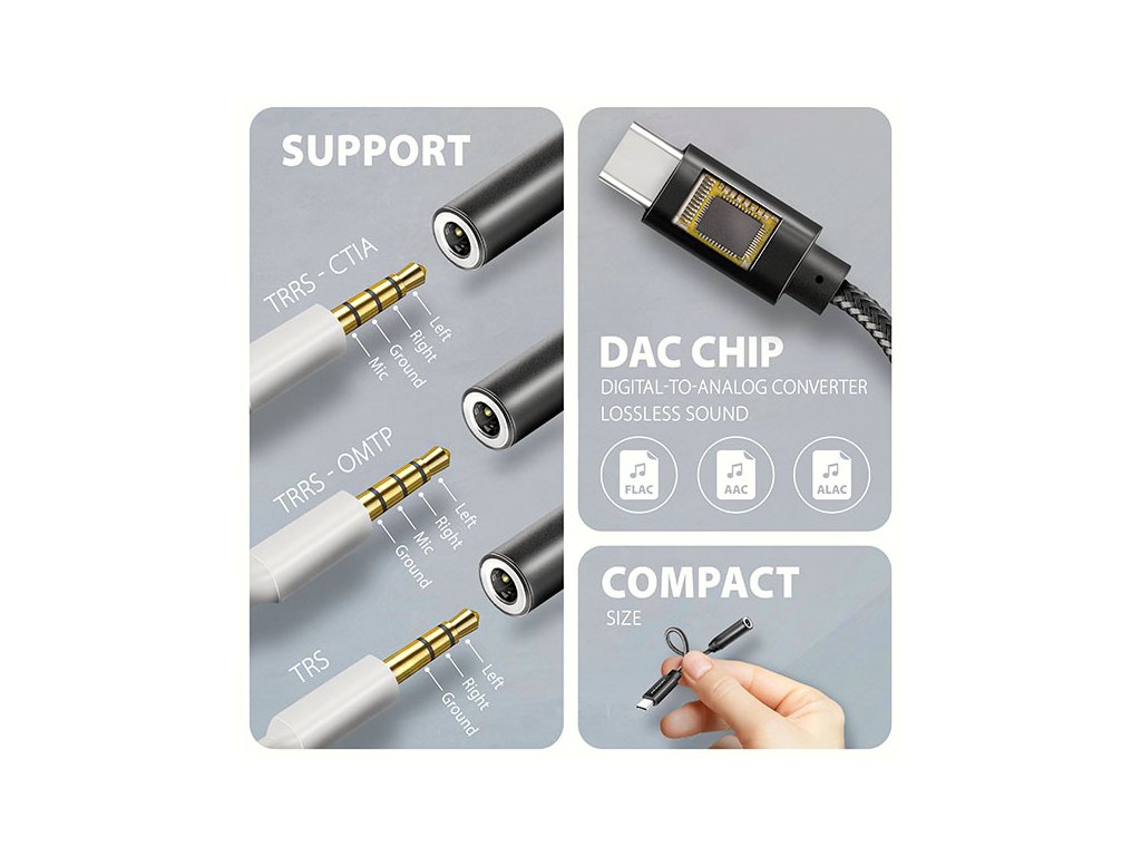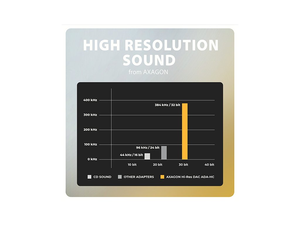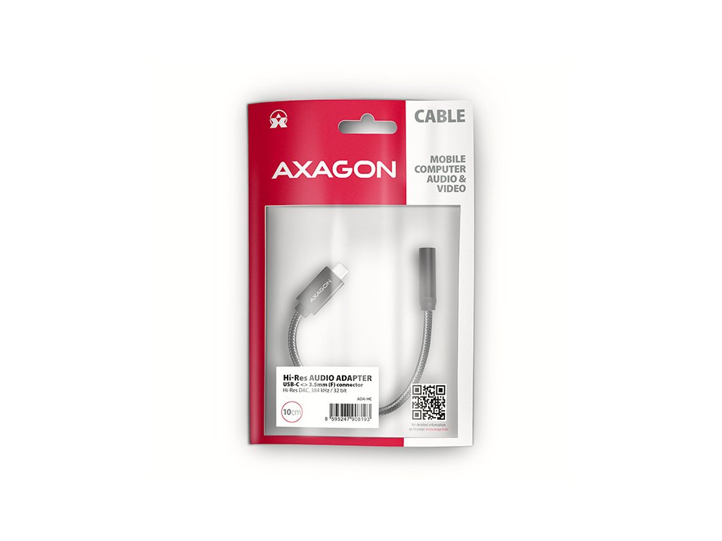 AXAGON ADA-HC Hi-Res DAC AUDIO ADAPTER je ideální doplňkem pro váš telefon, tablet, notebook nebo stolní počítač s USB-C konektorem, který vám poskytne chybějící 3.5 mm audio jack. Adaptér obsahuje vysoce kvalitní DAC převodník, který při přehrávání nabízí vzorkování až 384 kHz / 32 bitů, což zajišťuje vynikající zvukovou kvalitu. Tento adaptér je optimální volbou pro mobilní telefony a tablety, které již nejsou vybaveny konektorem pro sluchátka a disponují pouze USB-C portem. Mezi taková zařízení patří produkty od Samsungu, Apple (iPhone 15 a novější / iPad), Xiaomi, Honor a Huawei. Tato zvuková karta je optimální pro bezztrátové formáty jako FLAC, WMA, WAV, APE, AAC nebo ALAC v Apple Music atd. Poslech hudby v nejvyšší možné kvalitě je dostupný prostřednictvím prémiových účtů platforem jako jsou Spotify, Apple Music, YouTube Music a Amazon Music Unlimited. Kromě toho, můžete tento audio adaptér využít i pro nerušené sledování dalších oblíbených streamovacích služeb, jako jsou Netflix, Disney+, HBO Max, Amazon Prime nebo Apple TV+. Díky DAC převodníku si s ADA-HC můžete vychutnat hudbu ve vyšší kvalitě než pomocí standardního sluchátkového výstupu vašeho notebooku. Dobře také poslouží jako náhrada nefunkční původní zvukové karty v notebooku a nahradí tak sluchátkový výstup nebo vstup pro mikrofon. Výhodou je také možnost připojení mikrofonu nebo headsetu pro komunikační služby WhatsApp, Messenger, FaceTime, Skype, Zoom, MS Teams, Google Meet, Discord, a podobné. Můžete ho využít i pro propojení vašeho mobilního zařízení s AUX výstupem ve vašem automobilu. Pro připojení sluchátek slouží stereofonní 4pólový TRRS konektor s automatickou detekcí CTIA nebo OMTP standardu. Pevnost 10 cm dlouhého kabelu zajišťuje kvalitní nylonové opletení. Vstup: • 1x USB 480Mbps male konektor (USB 2.0) • připojovací USB konektor typu C male (samec) Audio výstup: • 2 kanálový analogový 32 bitový výstup (3.5 mm TRRS stereo jack) • stereo výstup pro sluchátka nebo aktivní reproduktory Audio vstup: • 2 kanálový analogový 16 bitový vstup (3.5 mm jack) • mikrofonní vstup a vstup pro nahrávání analogového signálu Vzorkovací frekvence, rozlišení a šum výstupního převodníku (DAC): • analog - 44.1 - 384 kHz @ 16 / 24 / 32 bit (PCM) pro přehrávání • odstup signál / šum (Output SNR) > 124 dBA (32 ohm, 30 mW reference signal, 20 Hz - 20 kHz) • harmonické zkreslení (Output THD+N) < -95 dB (32 ohm, 20 mW, 20 Hz - 20 kHz) Vzorkovací frekvence, rozlišení a šum vstupního převodníku (ADC): • analog - 48 kHz @ 16 bit (PCM) pro záznam • odstup signál / šum (Input SNR) > 99 dBA (0 dB gain, Vref = 0.5 Vrms, 20 Hz - 20 kHz) • harmonické zkreslení (Input THD+N) < -90 dB (0 dB gain, Vref = 0.5 Vrms, 20 Hz - 20 kHz) Další vlastnosti: • Vestavěný sluchátkový zesilovač 30 mW @ 32 ohm. • Rozsah impedance připojených sluchátek 16 - 200 ohm. • Frekvenční rozsah 20 Hz - 20 kHz. • Rozhraní USB 480Mbps (USB 2.0, zpětně kompatibilní s USB 1.1). • Snadná instalace díky plné podpoře Plug and Play. • Možnost připojení zařízení za chodu díky podpoře Hot Plug. • 3.5 mm jack, TRS, TRRS (CTIA & OMTP autodetekce) kompatibilní. • Vyhovuje USB Audio Device Class specifikaci v1.0. • Napájení adaptéru po USB sběrnici (bus power) - není potřeba žádné přídavné napájení. • Miniaturní rozměry 25 x 7 mm, délka kabelu 10 cm. • Hmotnost pouze 4 g. Nastavení zvukové karty ve Windows dovoluje: • nastavení hlasitosti a vyvážení reproduktorů • nastavení pro odposlech mikrofonu • rozšířené vlastnosti reproduktorů: virtuální prostorový zvuk, podpora Dolby Atmos • nastavení vzorkovací frekvence a bitové hloubky pro reprodukci Nastavení zvukové karty v Android dovoluje: • nastavení hlasitosti a vyvážení reproduktorů • rozšířené vlastnosti reproduktorů: virtuální prostorový zvuk, podpora Dolby Atmos • pohlcující zvuk Nastavení zvukové karty v iOS / iPadOS dovoluje: • nastavení hlasitosti • ochrana sluchu • optimalizace pro vyvážený zvuk Podporované operační systémy: • Windows 10 / 11 a novější, macOS, iPadOS, iOS, Linux, Chrome OS a Android Balení ve fóliovém obalu s otvorem pro zavěšení obsahuje: • USB-C audio adaptérDodatočné parametre