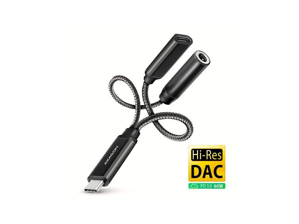AXAGON ADA-HCPD Hi-Res DAC AUDIO ADAPTER je ideální doplňkem pro váš telefon, tablet, notebook nebo stolní počítač s USB-C konektorem, který vám poskytne chybějící 3.5 mm audio jack. Velkou výhodu představuje integrovaný konektor Power Delivery, který umožňuje současné připojení nabíječky a tím poskytuje možnost napájení připojeného telefonu. Adaptér obsahuje vysoce kvalitní DAC převodník, který při přehrávání nabízí vzorkování až 384 kHz / 32 bitů, což zajišťuje vynikající zvukovou kvalitu. USB-C female konektor je vyhrazen pouze pro nabíjení telefonů nebo notebooků pomocí technologie Power Delivery 3.0 výkonem až 60W. Do konektoru zapojíte vhodnou nabíječku a zvukovku připojíte k telefonu. Zapomeňte na neustálé odpojování sluchátek kvůli nabíjení, užijte si nepřetržitou zábavu pří poslechu hudby, sledování filmu nebo hraní her. Tento adaptér je optimální volbou pro mobilní telefony a tablety, které již nejsou vybaveny konektorem pro sluchátka a disponují pouze USB-C portem. Mezi taková zařízení patří produkty od Samsungu, Apple (iPhone 15 a novější / iPad), Xiaomi, Honor a Huawei. Tato zvuková karta je optimální pro bezztrátové formáty jako FLAC, WMA, WAV, APE, AAC nebo ALAC atd. Poslech hudby v nejvyšší možné kvalitě je dostupný prostřednictvím prémiových účtů platforem jako jsou Spotify, Apple Music, YouTube Music a Amazon Music Unlimited. Kromě toho, můžete tento audio adaptér využít i pro nerušené sledování dalších oblíbených streamovacích služeb, jako jsou Netflix, Disney+, HBO Max, Amazon Prime nebo Apple TV+. Díky DAC převodníku si s ADA-HCPD můžete vychutnat hudbu ve vyšší kvalitě než pomocí standardního sluchátkového výstupu vašeho notebooku. Dobře také poslouží jako náhrada nefunkční původní zvukové karty v notebooku a nahradí tak sluchátkový výstup nebo vstup pro mikrofon. Výhodou je také možnost připojení mikrofonu nebo headsetu pro komunikační služby WhatsApp, Messenger, FaceTime, Skype, Zoom, MS Teams, Google Meet, Discord, a podobné. Můžete ho využít i pro propojení vašeho mobilního zařízení s AUX výstupem ve vašem automobilu. Pro připojení sluchátek slouží stereofonní 4pólový TRRS konektor s automatickou detekcí CTIA nebo OMTP standardu. Pevnost kabelu zajišťuje kvalitní nylonové opletení. Vstup (připojení k notebooku): • 1x USB 480Mbps male konektor (USB 2.0) • připojovací USB konektor typu C male (samec) Vstup (napájení): • USB Power Delivery 3.0 - 60W port, konektor USB-C female. • Napájení telefonu ze síťového adaptéru přes USB-C adapter. • Napájení PD musí podporovat jak telefon (notebook), tak síťová nabíječka. Audio výstup: • 2 kanálový analogový 32 bitový výstup (3.5 mm TRRS stereo jack) • stereo výstup pro sluchátka nebo aktivní reproduktory Audio vstup: • analogový 16 bitový vstup (3.5 mm jack) • mikrofonní vstup a vstup pro nahrávání analogového signálu Vzorkovací frekvence, rozlišení a šum výstupního převodníku (DAC): • analog - 44.1 - 384 kHz @ 16 / 24 / 32 bit (PCM) pro přehrávání • odstup signál / šum (Output SNR) > 124 dBA (32 ohm, 30 mW reference signal, 20 Hz - 20 kHz) • harmonické zkreslení (Output THD+N) < -95 dB (32 ohm, 20 mW, 20 Hz - 20 kHz) Vzorkovací frekvence, rozlišení a šum vstupního převodníku (ADC): • analog - 48 kHz @ 16 bit (PCM) pro záznam • odstup signál / šum (Input SNR) > 99 dBA (0 dB gain, Vref = 0.5 Vrms, 20 Hz - 20 kHz) • harmonické zkreslení (Input THD+N) < -90 dB (0 dB gain, Vref = 0.5 Vrms, 20 Hz - 20 kHz) Další vlastnosti: • Vestavěný sluchátkový zesilovač 30 mW @ 32 ohm. • Rozsah impedance připojených sluchátek 16 - 200 ohm. • Frekvenční rozsah 20 Hz - 20 kHz. • Rozhraní USB 480Mbps (USB 2.0, zpětně kompatibilní s USB 1.1). • Snadná instalace díky plné podpoře Plug and Play. • Možnost připojení zařízení za chodu díky podpoře Hot Plug. • 3.5 mm jack, TRS, TRRS (CTIA & OMTP autodetekce) kompatibilní. • Vyhovuje USB Audio Device Class specifikaci v1.0. • Napájení adaptéru po USB sběrnici (bus power) - není potřeba žádné přídavné napájení. • Rozměry 3.5 mm jacku 25 x 7 mm. • Rozměry USB-C male konektor 25 x 11 x 6 mm. • Rozměry USB-C female konektor 30 x 11 x 6 mm. • Délka adaptéru 10 cm. • Hmotnost pouze 10 g. Nastavení zvukové karty ve Windows dovoluje: • nastavení hlasitosti a vyvážení reproduktorů • nastavení pro odposlech mikrofonu • rozšířené vlastnosti reproduktorů: virtuální prostorový zvuk, podpora Dolby Atmos • nastavení vzorkovací frekvence a bitové hloubky pro reprodukci Nastavení zvukové karty v Android dovoluje: • nastavení hlasitosti a vyvážení reproduktorů • rozšířené vlastnosti reproduktorů: virtuální prostorový zvuk, podpora Dolby Atmos • pohlcující zvuk Nastavení zvukové karty v iOS / iPadOS dovoluje: • nastavení hlasitosti • ochrana sluchu • optimalizace pro vyvážený zvuk Podporované operační systémy: • Windows 10 / 11 a novější, macOS, iPadOS, iOS, Linux, Chrome OS a Android Balení ve fóliovém obalu s otvorem pro zavěšení obsahuje: • USB-C audio / PD adaptérDodatočné parametre