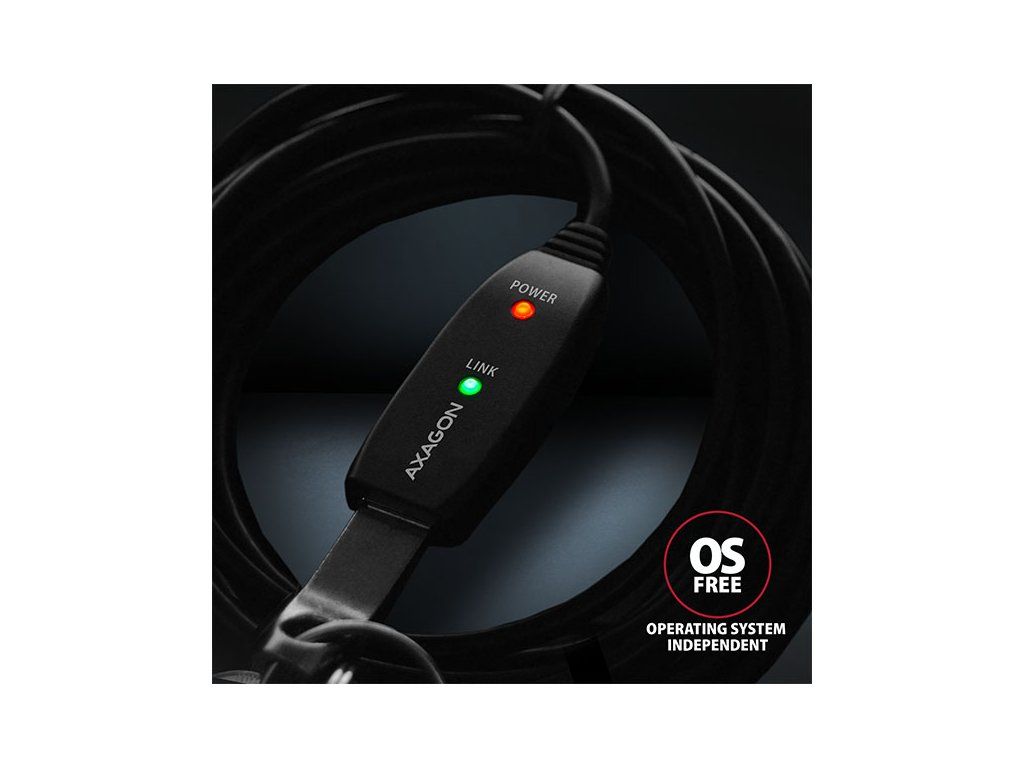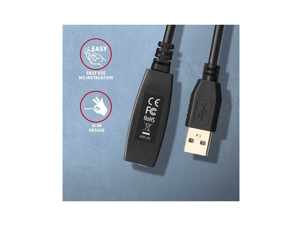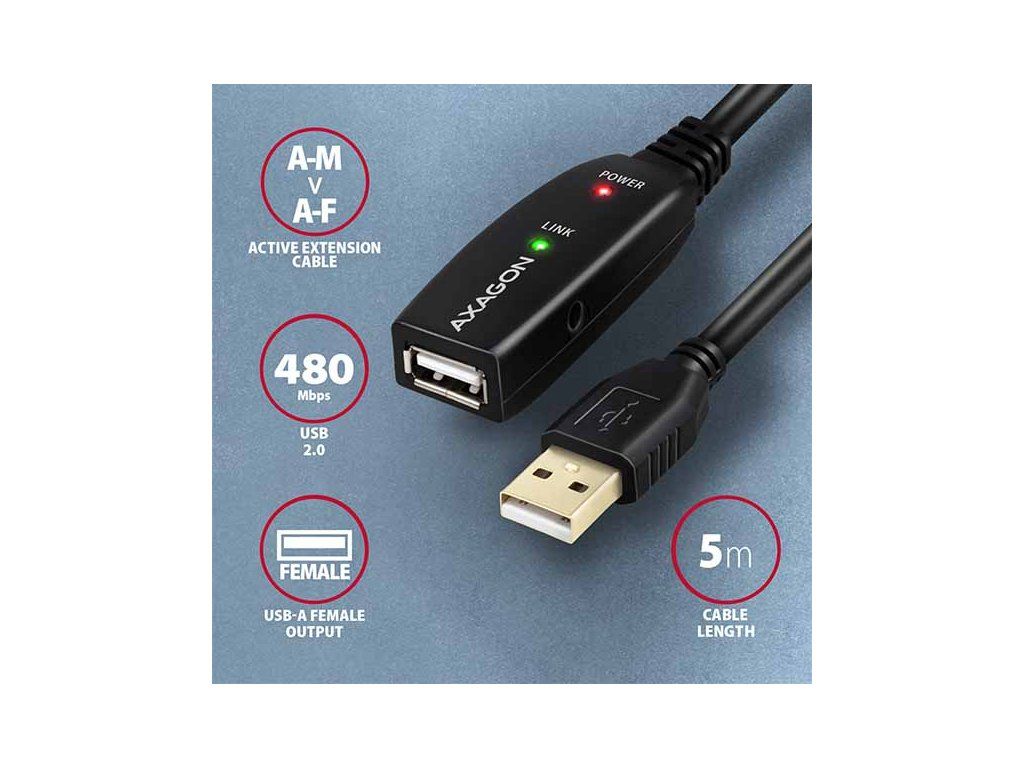 Aktivní prodlužovací USB 2.0 kabel AXAGON ADR-205 délky 5 metrů je ideální k propojení Vašeho počítače s USB zařízením jako je myš, klávesnice, webkamera, tiskárna, skener, plotr a dalšími. Aktivní USB repeater kabel zesiluje průchozí signál a umožnuje připojit USB zařízení na výrazně větší vzdálenost, než Vám umožní pasivní kabel. Dosah kabelu je možné dále prodloužit použitím několika kabelů za sebou. Velkou výhodou kabelu ADR-205 je integrovaný konektor přídavného napájení. Ve většině případů postačí napájení po USB sběrnici, avšak u zařízení s větším odběrem může být při větších vzdálenostech USB napájení nedostatečné a přídavné napájení ze sítě může v těchto případech problém vyřešit. Výjimečně kompaktní tělo repeater kabelu dovoluje bezproblémové použití v elektromontážních lištách nebo kabelových systémech. Použití kvalitního stíněného kabelu zaručuje vysokou rychlost komunikace a minimální nežádoucí interference. Vstup: • USB 2.0 pro připojení k počítači • konektor USB typu A (M) male (samec) Výstup: • USB 2.0 pro připojení vzdáleného USB zařízení • konektor USB typu A (F) female (samice) • Přenosová rychlost 480 / 12 / 1.5 Mbit/s (high / full / low speed) Napájení: • Napájení kabelu i připojených zařízení po USB sběrnici (bus-power mód 5V - 500mA). • Pro většinu připojených USB zařízení je napájení po USB sběrnici dostatečné a není potřeba žádné přídavné napájení. • Aktivní část kabelu obsahuje konektor (O 3.5 x 1.3mm vnější x vnitřní průměr) pro přídavné externí napájení 5V/1-2A. • Napájecí kabel USB A-M / 3.5mm jack délky 1.2 m je součástí balení. Kabel umožní napájení z běžné nabíječky mobilních telefonů s USB-A výstupem 5V / min. 1A, např. AXAGON ACU-DS16. • Při napájení repeater kabelu napájecím adaptérem lze připojit i externí 2.5'' disk bez potřeby vlastního napájení disku. • U delší USB trasy s několika repeater kabely zapojenými za sebou může být již napájení po USB sběrnici nedostatečné i pro USB zařízení s nižším odběrem než externí 2.5'' disk. Také v tomto případě může pomoci posílení napájení připojením napájecího adaptéru. Další vlastnosti: • Plně kompatibilní s USB 2.0 a zpětně kompatibilní s USB 1.1. • Plná podpora Plug and Play a Hot Plug. • Dvě LED indikující připojení k napájení a připojení USB zařízení. • Za aktivním USB kabelem může být použit i běžný pasivní USB kabel. • Rozměry aktivní části jsou 74 x 22 x 13 mm, kabel délky 5 m. • Váha 170 g. Podporované operační systémy: • MS Windows XP / Vista / 7 / 8 / 8.1 / 10 / 11 a novější, Windows Server 2003 / 2008 / 2012 / 2016 / 2019 / 2022 a novější (podporovány všechny 32- i 64-bitové verze OS Windows), Mac OS X 10.x a vyšší, Linux s jádrem 2.6.x a vyšším. • Pozn.: Ovladače jsou součástí podporovaných operačních systémů a nainstalují se zcela automaticky. Žádné jiné ovladače není třeba instalovat a nejsou ani k dispozici. Balení v kartonové krabičce obsahuje: • USB 2.0 A-M > A-F aktivní kabel délky 5 m, • USB-A / 3.5 mm napájecí kabel, • vícejazyčný návod CZ/DE/DK/ENG/ESP/FIN/FR/GR/HR/HU/IT/NL/PL/PT/RO/RU/SK/SWE/BG/CN/TR/ARA.Dodatočné parametre