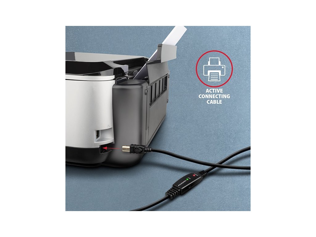 Aktivním propojovacím USB 2.0 kabelem AXAGON ADR-220B délky 20 metrů budete moci připojit např. tiskárnu, skener, plotr nebo další USB-B zařízení k Vašemu počítači. Aktivní USB repeater kabel zesiluje průchozí signál a umožnuje připojit USB-B zařízení na výrazně větší vzdálenost, než Vám umožní pasivní kabel. Dosah kabelu je možné dále prodloužit např. použitím prodlužovacího USB kabelu AXAGON ADR-210. Velkou výhodou kabelu ADR-220B je integrovaný konektor přídavného napájení. Ve většině případů postačí napájení po USB sběrnici, avšak u zařízení s větším odběrem může být při větších vzdálenostech USB napájení nedostatečné a přídavné napájení ze sítě může v těchto případech problém vyřešit. Výjimečně kompaktní tělo repeater kabelu dovoluje bezproblémové použití v elektromontážních lištách nebo kabelových systémech. Použití kvalitního stíněného kabelu zaručuje vysokou rychlost komunikace a minimální nežádoucí interference. Vstup: • USB 2.0 pro připojení k počítači • konektor USB typu A (M) male (samec) Výstup: • USB 2.0 pro připojení vzdáleného USB zařízení • konektor USB typu B (M) male (samec) • Přenosová rychlost 480 / 12 / 1.5 Mbit/s (high / full / low speed) Napájení: • Napájení kabelu i připojených zařízení po USB sběrnici (bus-power mód 5V - 500mA). • Pro většinu připojených USB zařízení je napájení po USB sběrnici dostatečné a není potřeba žádné přídavné napájení. • Aktivní část kabelu obsahuje konektor (O 3.5 x 1.3mm vnější x vnitřní průměr) pro přídavné externí napájení 5V/1-2A. • Napájecí kabel USB A-M / 3.5mm jack délky 1.2 m je součástí balení. Kabel umožní napájení z běžné nabíječky mobilních telefonů s USB-A výstupem 5V / min. 1A, např. AXAGON ACU-DS16. Další vlastnosti: • Plně kompatibilní s USB 2.0 a zpětně kompatibilní s USB 1.1. • Plná podpora Plug and Play a Hot Plug. • Dvě LED indikující připojení k napájení a připojení USB zařízení. • Za aktivním USB kabelem může být použit i běžný pasivní USB kabel. • Rozměry aktivní části jsou 95 x 22 x 13 mm, kabel délky 20 m. • Váha 674 g. Podporované operační systémy: • MS Windows XP / Vista / 7 / 8 / 8.1 / 10 / 11 a novější, Windows Server 2003 / 2008 / 2012 / 2016 / 2019 a novější (podporovány všechny 32- i 64-bitové verze OS Windows), Mac OS X 10.x a vyšší, Linux s jádrem 2.6.x a vyšším. • Pozn.: Ovladače jsou součástí podporovaných operačních systémů a nainstalují se zcela automaticky. Žádné jiné ovladače není třeba instalovat a nejsou ani k dispozici. Balení v kartonové krabičce obsahuje: • USB 2.0 A-M > B-M aktivní kabel délky 20 m, • USB-A / 3.5 mm napájecí kabel, • vícejazyčný návod CZ/DE/DK/ENG/ESP/FIN/FR/GR/HR/HU/IT/NL/PL/PT/RO/RU/SK/SWE/BG/CN/TR/ARA.Dodatočné parametre