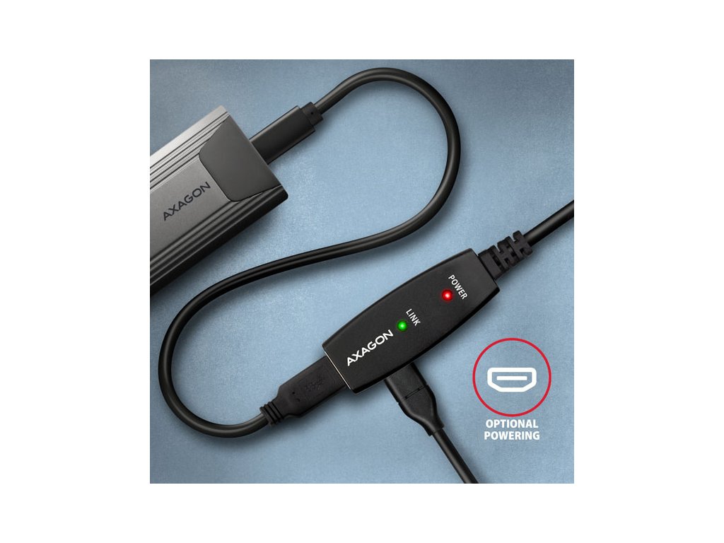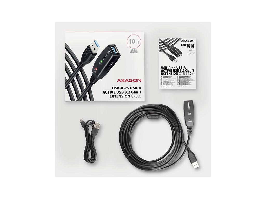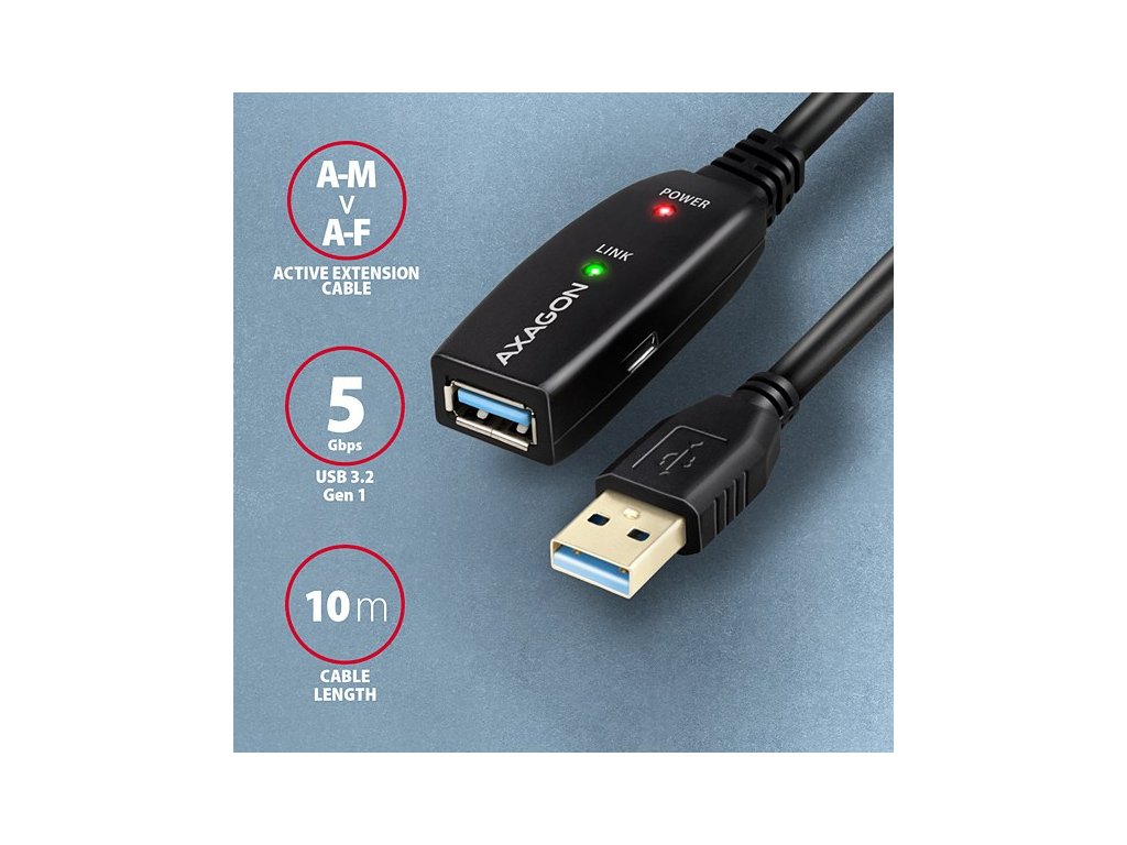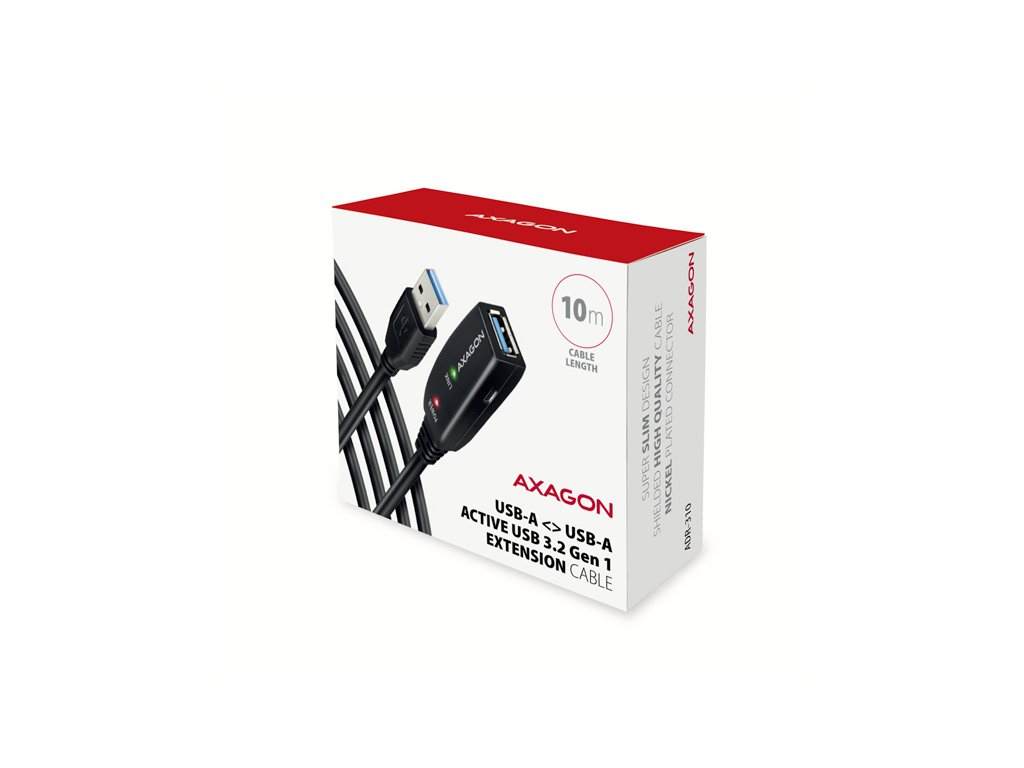 Aktivní prodlužovací USB 3.2 Gen 1 kabel AXAGON ADR-310 délky 10 metrů je ideální k propojení Vašeho počítače s USB zařízením jako je myš, klávesnice, webkamera, tiskárna, skener, plotr a dalšími. Aktivní USB repeater kabel zesiluje průchozí signál a umožnuje připojit USB zařízení na výrazně větší vzdálenost, než Vám umožní pasivní kabel. Dosah kabelu je možné dále prodloužit použitím několika kabelů za sebou. Díky použitému USB 3.2 Gen 1 (dříve USB 3.0) rozhraní si můžete užívat rychlost přenosu dat až 5 Gbps. Tak kabel využijete i na zařízení vyžadující větší rychlost jako jsou zálohovací systémy, datová úložiště NAS a další. Velkou výhodou kabelu ADR-310 je integrovaný konektor přídavného napájení. Ve většině případů postačí napájení po USB sběrnici, avšak u zařízení s větším odběrem může být při větších vzdálenostech USB napájení nedostatečné a přídavné napájení ze sítě může v těchto případech problém vyřešit. Výjimečně kompaktní tělo repeater kabelu dovoluje bezproblémové použití v elektromontážních lištách nebo kabelových systémech. Použití kvalitního stíněného kabelu zaručuje vysokou rychlost komunikace a minimální nežádoucí interference. Vstup: • USB 3.2 Gen 1 pro připojení k počítači • konektor USB typu A (M) male (samec) Výstup: • USB 3.2 Gen 1 pro připojení vzdáleného USB zařízení • konektor USB typu A (F) female (samice) • Přenosová rychlost 5000 / 480 / 12 / 1.5 Mbit/s (super / high / full / low speed) Napájení: • Napájení kabelu i připojených zařízení po USB sběrnici (bus-power mód 5V - 500mA). • Pro většinu připojených USB zařízení je napájení po USB sběrnici dostatečné a není potřeba žádné přídavné napájení. • Aktivní část kabelu obsahuje Micro USB konektor pro přídavné externí napájení 5V/1-2A. • Napájecí kabel USB A-M / Micro USB délky 1.2 m je součástí balení. Kabel umožní napájení z běžné nabíječky mobilních telefonů s USB-A výstupem 5V / min. 1A, např. AXAGON ACU-DS16. • Při napájení repeater kabelu napájecím adaptérem lze připojit i externí 2.5'' disk bez potřeby vlastního napájení disku. • U delší USB trasy s několika repeater kabely zapojenými za sebou může být již napájení po USB sběrnici nedostatečné i pro USB zařízení s nižším odběrem než externí 2.5'' disk. Také v tomto případě může pomoci posílení napájení připojením napájecího adaptéru. Další vlastnosti: • Plně kompatibilní s USB3.2 Gen1 (USB 3.0) a zpětně kompatibilní s USB 2.0 a USB 1.1. • Plná podpora Plug and Play a Hot Plug. • Dvě LED indikující připojení k napájení a připojení USB zařízení. • Za aktivním USB kabelem může být použit i běžný pasivní USB kabel. • Rozměry aktivní části jsou 75 x 24 x 13 mm, kabel délky 10 m. • Váha 408 g. Podporované operační systémy: • MS Windows XP / Vista / 7 / 8 / 8.1 / 10 / 11 a novější, Windows Server 2003 / 2008 / 2012 / 2016 / 2019 / 2022 a novější (podporovány všechny 32- i 64-bitové verze OS Windows), Mac OS X 10.x a vyšší, Linux s jádrem 2.6.x a vyšším. • Pozn.: Ovladače jsou součástí podporovaných operačních systémů a nainstalují se zcela automaticky. Žádné jiné ovladače není třeba instalovat a nejsou ani k dispozici. Balení v kartonové krabičce obsahuje: • USB 3.0 A-M > A-F aktivní kabel délky 10 m, • USB-A / Micro USB napájecí kabel, • vícejazyčný návod CZ/DE/DK/ENG/ESP/FIN/FR/GR/HR/HU/IT/NL/PL/PT/RO/RU/SK/SWE/BG/CN/TR/ARA.Dodatočné parametre
