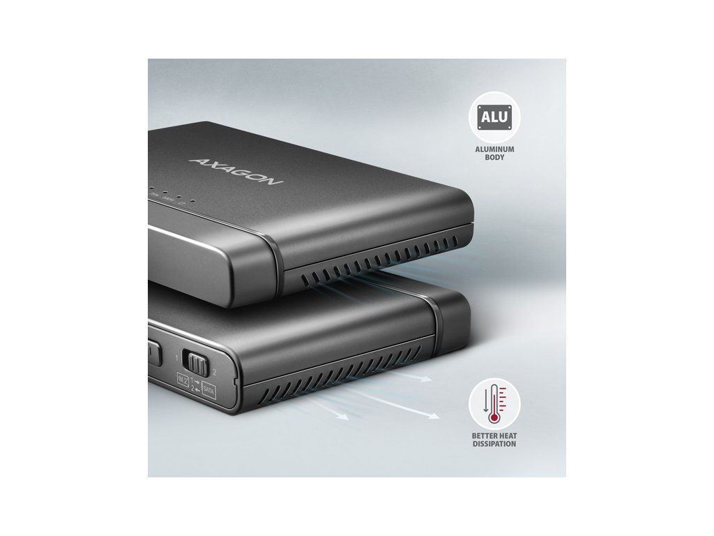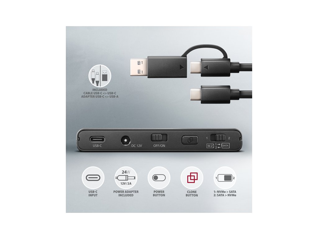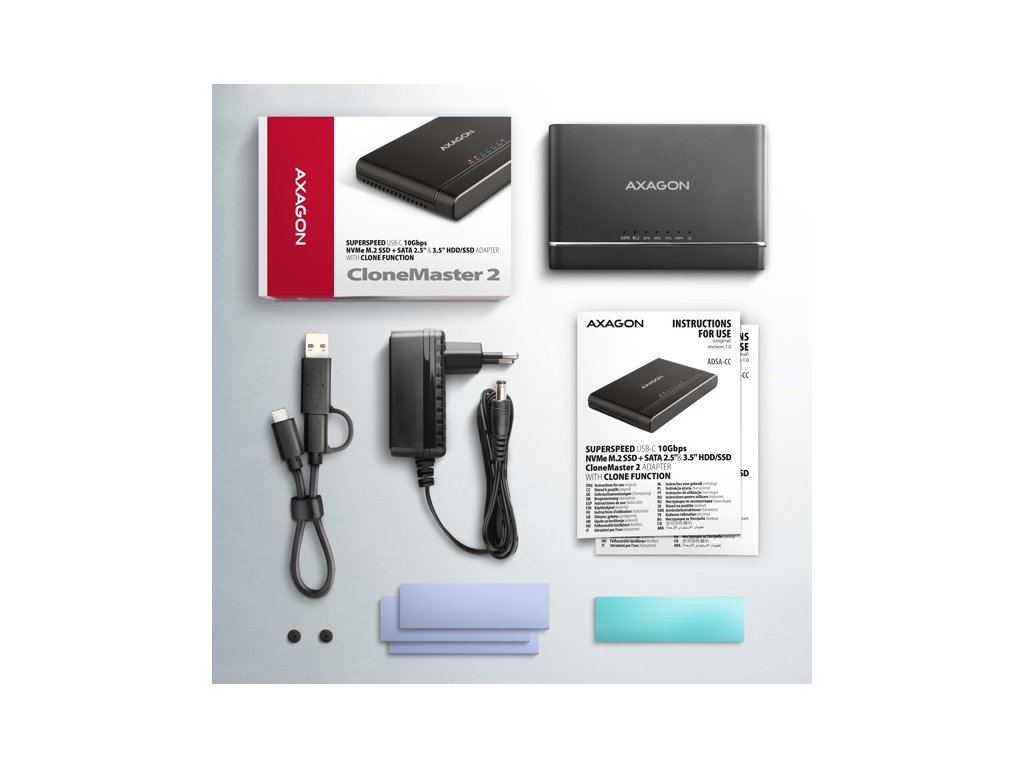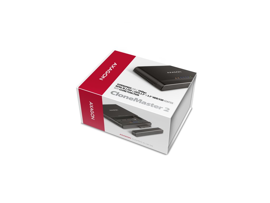 Univerzální USB-C 10Gbps adaptér AXAGON ADSA-CC CLONE MASTER 2 připojí k počítači snadno a rychle až dva disky současně. Jakýkoliv 2.5'' nebo 3.5'' disk snadno připojíte přímo k externímu SATA konektoru adaptéru. NVMe M.2 disk jednoduše vložíte do těla adaptéru bez použití šroubováku nebo jiných nástrojů. K adaptéru můžete připojit i SATA M.2 disk s použitím redukce jako je například AXAGON RSS-M2SD. V balení naleznete kabel USB-C <-> USB-C s napevno uchycenou redukcí USB-C -> USB-A. Toto řešení zvyšuje univerzálnost adaptéru, který tak můžete připojit k jakémukoliv USB portu počítače, ať už k oboustrannému USB-C konektoru nebo k tradičnímu USB-A konektoru. Díky funkci klonování bez potřeby připojení k PC lze adaptér využít jako autonomní zařízení pro pohodlné duplikování a vytváření obrazů disků. Směr klonování je nastavitelný pomocí přepínače a můžete si tak snadno zvolit, zda budete klonovat obsah NVMe M.2 disku na SATA disk nebo naopak. Po zkopírování všech dat je na cílovém disku přesná kopie původního disku. Jedná se o nejjednodušší způsob, jak přenést obsah jednoho disku na další disk, a to včetně funkčního operačního systému (Windows, macOS, Linux …). Kromě rychlého rozhraní USB 10Gbps podporuje adaptér také všechny důležité funkce pro bezproblémovou práci s různými typy disků. Jsou to UASP pro rychlejší přenos dat, TRIM pro omezení pozvolné degradace výkonu SSD v čase, S.M.A.R.T. pro monitoring stavu disků, BOOT pro možnost bootování z disků připojených k adaptéru, Auto Spindown pro automatické uspání disků při delší nečinnosti, Turn Off pro vypnutí disků po odebrání zařízení nebo uspání PC a USB Bus Power pro napájení adaptéru včetně připojených M.2 a 2.5'' disků jen z USB sběrnice. V případě připojení 3.5'' disku je již samozřejmě nutné použít přibalený napájecí adaptér. Uvedené vlastnosti dělají z adaptéru CLONE MASTER 2 velice šikovný a užitečný nástroj pro častou práci s různými druhy disků. Jedná se tak o ideálního pomocníka pro zálohování, migraci, přenos a ukládání dat, testování a klonování disků apod. Vstup: • USB 10Gbps (USB 3.2 Gen 2). • Rychlost až 10 Gbit/s. • Připojení přes reverzibilní USB type C female konektor. Podpora zařízení v M.2 slotu: • NVMe (PCI-Express) M.2 SSD jedno i oboustranné disky. • Podpora M.2 disků o rozměrech 2242, 2260, 2280 mm. • Podpora M-KEY & B+M-KEY NVMe M.2 SSD disků. • Bez omezení kapacity disku. Podpora zařízení připojených k SATA portu: • SATA 2.5''/3.5'' HDD/SSD. • SATA M.2 SSD s redukcí M.2 -> SATA např. AXAGON RSS-M2SD. • Bez omezení kapacity disku. Funkce klonování obsahu disku: • Klonování probíhá bez připojení stanice k počítači. • Cílový disk musí mít stejnou nebo větší kapacitu než disk zdrojový, jinak nelze klonování spustit. • Přepínač směru klonování - z NVMe M.2 disku na SATA disk nebo ze SATA disku na NVME M.2 disk. • Rychlost klonování SSD až 500 MB/s. • Celkový čas naklonování disku závisí na kapacitě zdrojového disku, ne na objemu dat na disku. Další vlastnosti: • Kompatibilní s USB 10Gbps (USB 3.2 Gen 2) • Zpětně kompatibilní s USB 5Gbps (3.2 Gen 1 / USB 3.0) a USB 480Mbps (USB 2.0). • Podpora přenosových rychlostí 10.000 / 5.000 / 480 Mbit/s. • Vyhovuje PCI Express Base Specification Revision 3.1a specifikaci. • Vyhovuje NVM Express 1.3c specifikaci. • Celková propustnost / přenosová rychlost adaptéru je dána použitým USB 3.2 Gen 2 rozhraním (teoreticky až 10 Gbit/s). • Reálná propustnost / přenosová rychlost adaptéru kolem 1.000 MB/s (1 GB/s) je dána limity USB 3.2 Gen 2 rozhraní. • Vyhovuje Serial ATA 3.0 specifikaci (SATA/600), přenosové rychlosti až 6 Gb/s (600 MB/s). • Vyhovuje Serial ATA 2.0 specifikaci (SATA/300), přenosové rychlosti až 3 Gb/s (300 MB/s). • Vyhovuje Serial ATA 1.0 specifikaci (SATA/150), přenosové rychlosti až 1.5 Gb/s (150 MB/s). • Vyhovuje USB Mass Storage Class specifikaci. • Podpora UASP (USB Attached SCSI) pro rychlejší přenos dat ve Windows 8.1 a novějších. • Podpora TRIM pro omezení pozvolné degradace výkonu SSD v čase. • Podpora S.M.A.R.T. (Self-Monitoring, Analysis, and Reporting Technology) systém monitorující stav disku. • Podpora bootování z disků připojených k adaptéru. • HDD Auto Spindown - automatické uspání disků při nečinnosti trvající 10 minut. • HDD Turn Off - vypnutí disku po odebrání zařízení nebo uspání PC. • Plná podpora Plug and Play. • Připojení přes USB-C female konektor. • Kabel délky 30 cm USB-C male / USB-C male + USB-C / USB-A redukce součástí balení. • Rozměry adaptéru 102 x 68 x 15 mm. • Hmotnost adaptéru 73 g (bez příslušenství). Napájení: • USB Bus Power - pro M.2 a 2.5'' disky stačí napájení po USB sběrnici. • Self Power - pro 3.5'' disky je nutné napájení pomocí přiloženého externího AC/DC adaptéru 12V - 2A s kabelem délky 150 cm. • Vypínač napájení. LED indikace: • zelená LED dioda indikuje zapnuté napájení adaptéru (trvalým svitem). • 2x oranžová LED dioda indikuje připojení pro každý z disků (trvalým svitem) a přenos dat (blikáním). • 4x modrá LED dioda indikuje průběh klonování 25%-50%-75%-100% (blikáním), resp. dokončení klonování (trvalým svitem). Podporované operační systémy: • Windows 8.1 / 10 / 11 a novější, • Windows Server 2012 R2 / 2016 / 2019 / 2022 a novější, • Mac OS X 10.x a vyšší, • Linux s jádrem 2.6.x a vyšším. Balení v kartonové krabičce obsahuje: • M.2 + 2.5''/3.5'' HDD/SSD adaptér, • napájecí adaptér 100-240V / 12V-2A, • 4ks teplovodivé podložky, • USB-C <-> USB-C kabel 30 cm + USB-C -> USB-A redukce, 