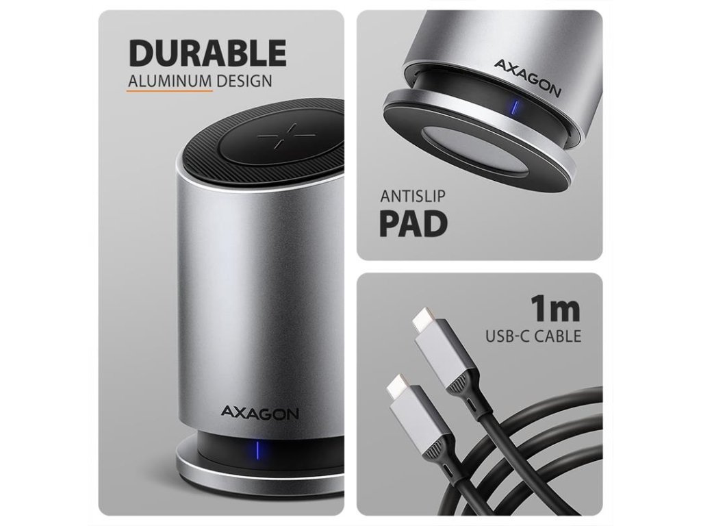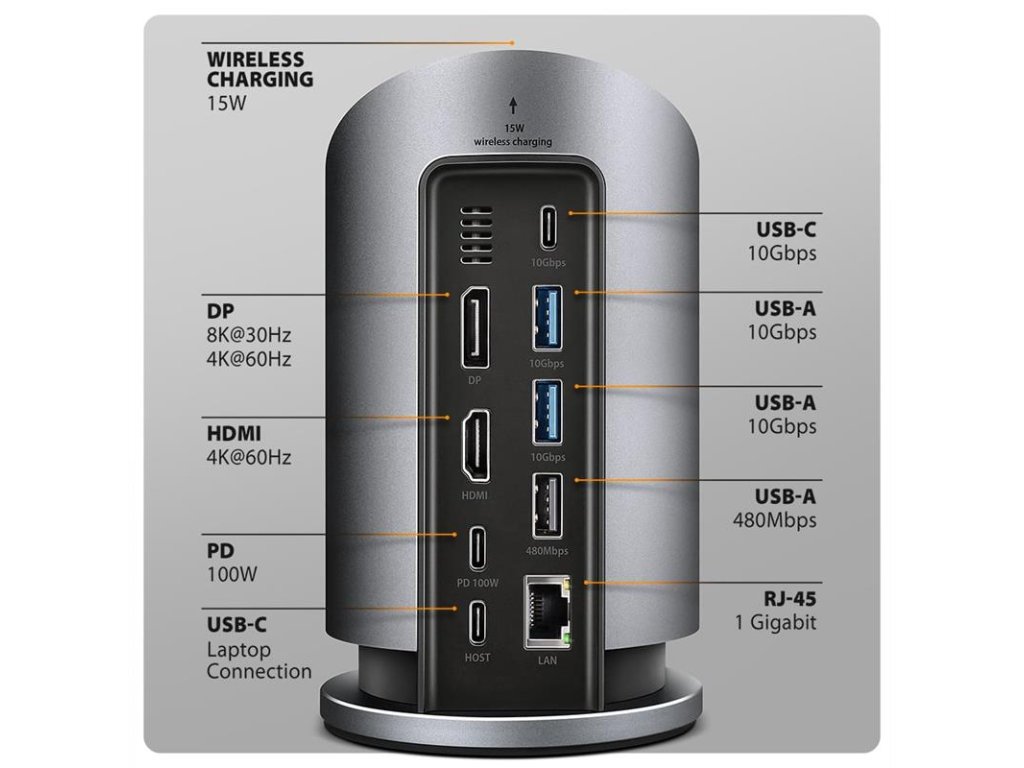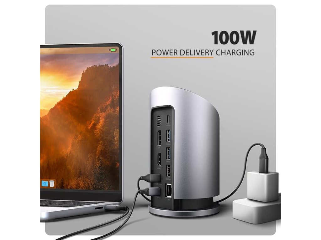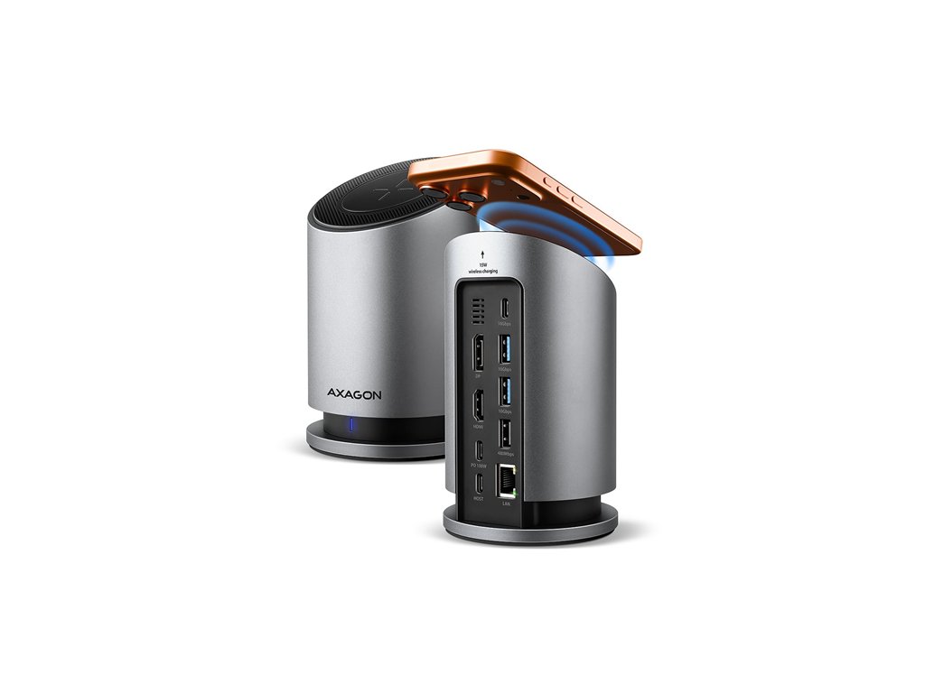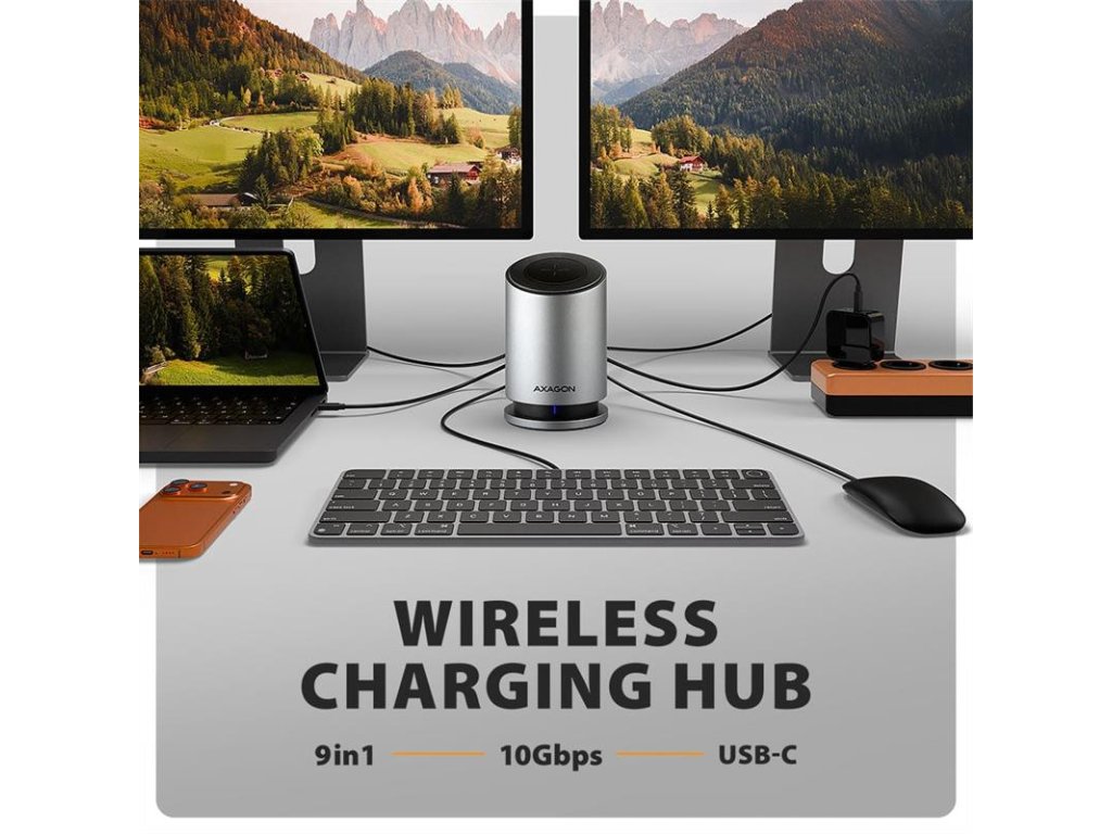 Multiportový USB-C 10Gbps AXAGON HMC-WL9 WIRELESS CHARGING 9in1 hub rozšíri váš notebook, počítač alebo telefón o dva video výstupy, LAN konektor, USB porty a bezdrôtovú nabíjačku. K hubu pripojíte notebook pomocou 60 cm dlhého kábla USB-C. Okamžite tak máte k dispozícii pripojenie pre dva 4K monitory, štyri USB zariadenia a konektor RJ-45 pre Gigabitovú Ethernet sieť. Zároveň získate možnosť napájania notebooku pomocou technológie Power Delivery. Vďaka kompatibilite s rozhraním Thunderbolt 3/4/5 môžete dokovaciu stanicu 9v1 použiť aj s notebookmi, ako sú napríklad Apple MacBook Air alebo MacBook Pro.