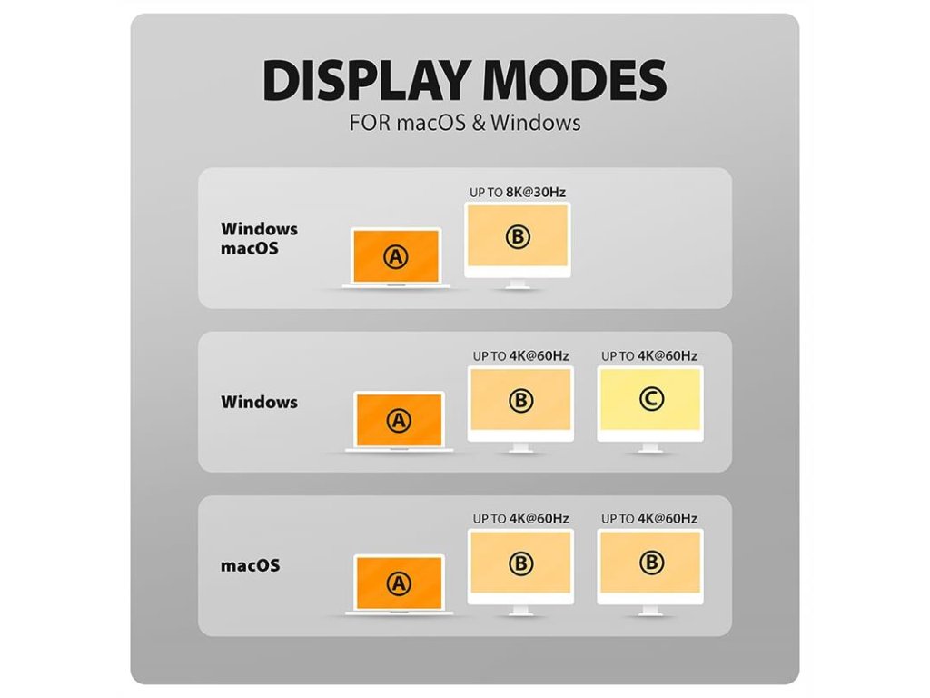 • Pre dosiahnutie maximálne hodnoty rozlíšenia a frekvencie na video výstupoch, dokovacia stanica musí byť pripojená k portu USB-C s podporou DisplayPort Alternate Mode (DP Alt Mode) vo verzii min. 1.4 alebo do USB-C portu s podporou min. Thunderbolt 3. Ďalej je nutný aj vhodný aktualizovaný operačný systém a aktuálne grafické ovládače.