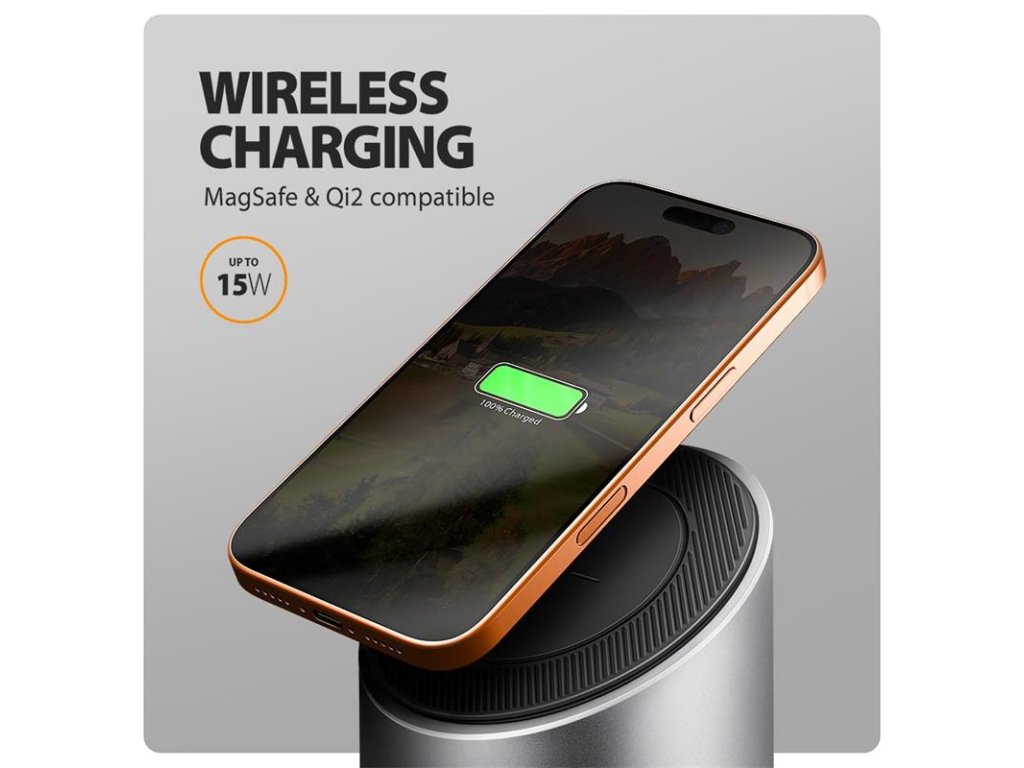 Bezdrôtové nabíjanie pre mobilné telefóny s výkonom až 15 W je integrované priamo do tela hubu. Vďaka magnetickému systému uchytenia stačí telefón jednoducho priložiť – automaticky sa vyrovná do optimálnej pozície. Nabíjanie je tak maximálne efektívne, bezpečné a pohodlné. Samozrejmosťou je kompatibilita so štandardmi Qi1, Qi2 a MagSafe. Na dosiahnutie maximálneho výkonu bezdrôtového nabíjania je potrebné použiť 100 W PD nabíjací adaptér.