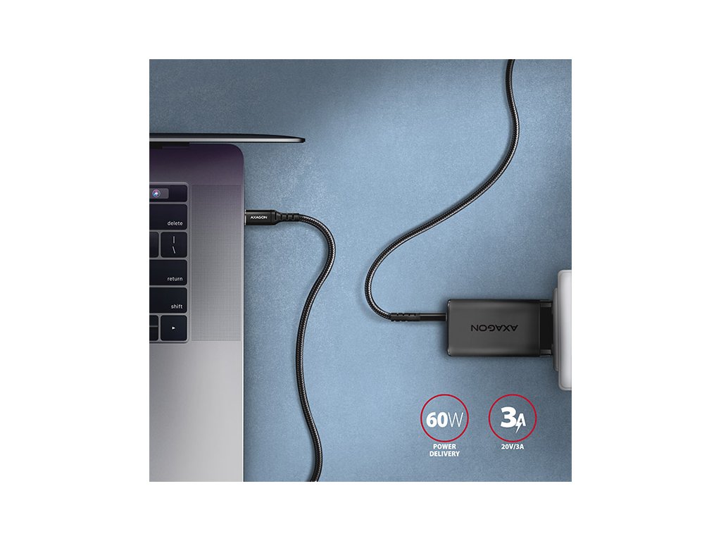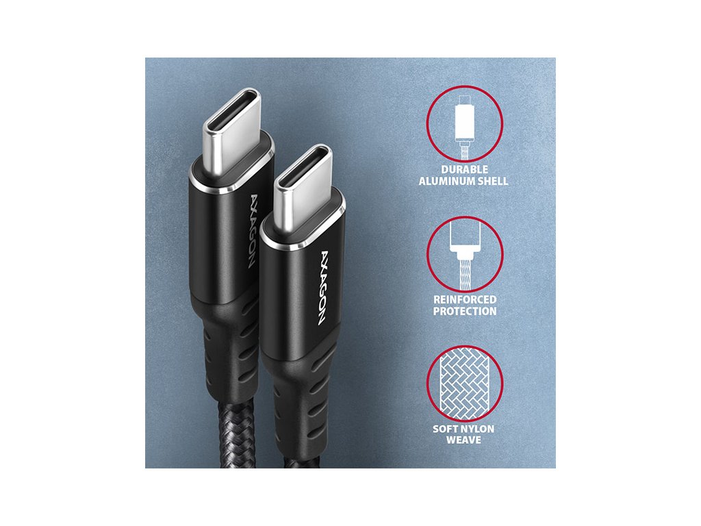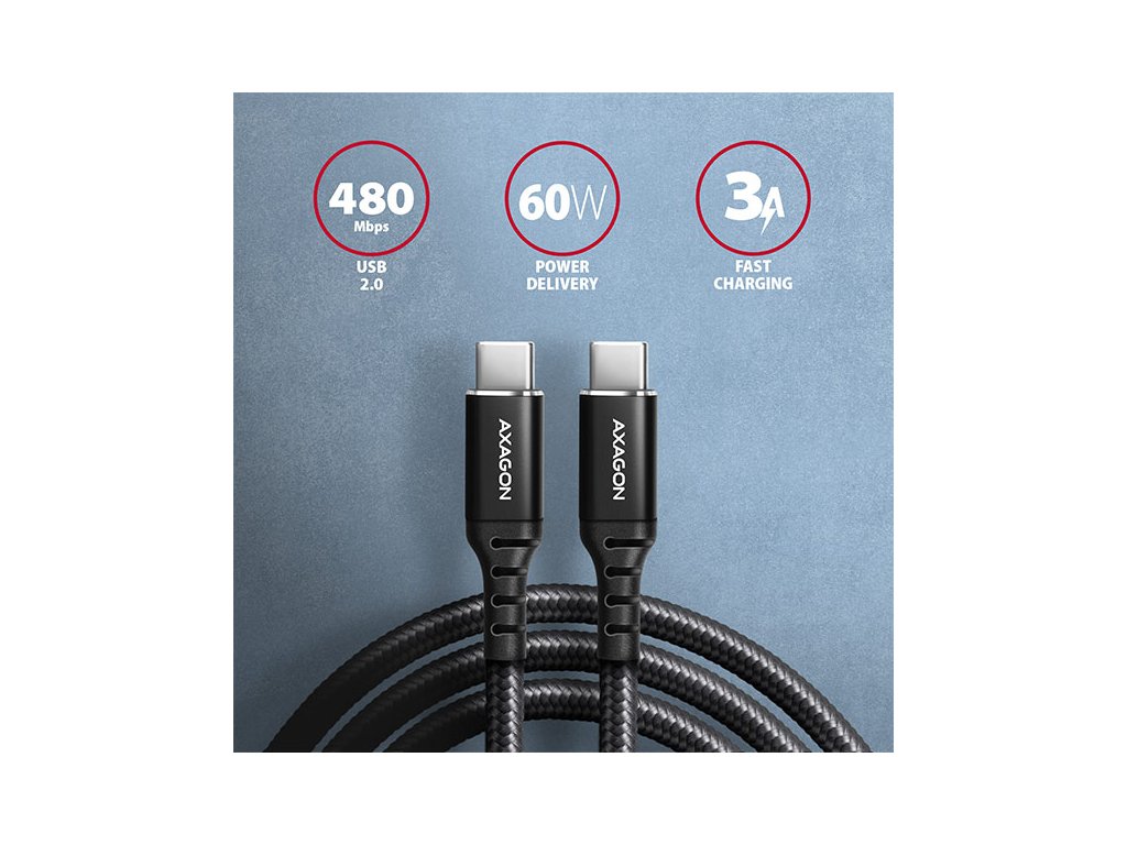 AXAGON BUCM-CM20AB, HQ kábel USB-C <-> USB-C, 2m, USB 2.0, PD 60W 3A, ALU, oplet, čierny BUCM-CM20AB