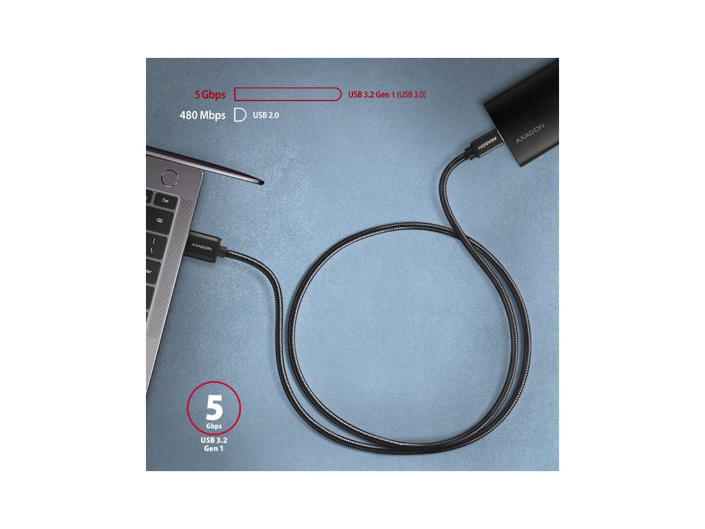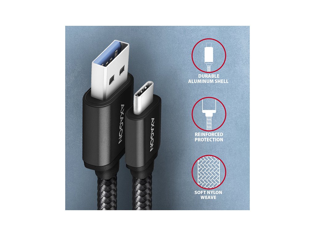 Prémiový propojovací USB-C <-> USB-A datový a nabíjecí AXAGON BUCM3-AM10AB SPEED USB 3.2 Gen 1 kabel s konektory USB-C male a USB-A male. Kabel je navržen pro rychlé datové přenosy a nabíjení notebooků, telefonů, tabletů a dalších mobilních zařízení. Podporuje přenos dat rychlostí až 5 Gb/s a nabíjení proudem až 3A. Odolný datový a napájecí kabel s prodlouženou životností je opatřen kovovými koncovkami, konektory s poniklovaným povrchem a pozlacenými kontakty. Vodiče kabelu jsou vyrobené z pocínované bezkyslíkaté mědi. Kvalitní izolace kabelu, vyrobená z flexibilního TPE, zaručuje maximální odolnost, ale zachovává i dostatečnou ohebnost. Konečnou pevnost kabelu dodává nylonový oplet. Bonusem je praktická páska pro snadné sbalení kabelu. Napájecí vodiče 22AWG (nižší číslo = větší průřez a nižší odpor vodiče) garantují rychlé nabíjení telefonů a dalších mobilních zařízení. Datové vodiče 30AWG spolu s kvalitním stíněním, zajišťují spolehlivý přenos dat. Trojité stínění chrání přenášené signály před nepříznivým rušením. Nylonový oplet v kombinaci s kabelovou průchodkou podstatně zmírňují nebezpečný ohyb kabelu. Životnost kabelu je tak prodloužena na více jak 8000 standardních ohybů. Mechanickou odolnost kabelu zvyšují také hliníkové kryty koncovek. Konektory: • USB-C (M) male / samec • USB-A (M) male / samec Další vlastnosti: • DATA SYNC & FAST CHARGING - současný přenos dat a dobíjení baterie mobilního zařízení. • SuperSpeed USB - USB 3.2 Gen 1 (dříve USB 3.1 Gen 1 / USB 3.0). • Kompatibilní také s USB 3.2 Gen 2, zpětně kompatibilní s USB 2.0. • Podpora přenosových rychlostí 5.000 / 480 / 12 / 1.5 Mb/s (SuperSpeed / High / Full / Low speed). • Podpora rychlého nabíjení proudem až 3A. • Podporované technologie nabíjení: Qualcomm Quick Charge 2.0 / 3.0 / 4+, Samsung Adaptive Fast Charging, Huawei Fast Charge Protocol, SMART Charging a další. • Kabel obsahuje napájecí vodiče 22AWG, datové vodiče 30AWG. • Vodiče z pocínované bezkyslíkaté mědi pro omezení oxidace, zvýšení vodivosti a čistý signál bez zkreslení. • Dvojnásobné stínění pokovenou fólií a opletení z pocínované mědi minimalizuje rušení a zabraňuje ztrátě signálu. • Poniklované konektory a pozlacené kontakty zamezují oxidaci a zajišťují spolehlivé spojení. • Vhodný pro mobilní telefony a smartphony, tablety, powerbanky a další mobilní zařízení s USB-C konektorem. Další údaje: • délka kabelu 1 m, • vnější průměr kabelu 4.5 mm. Balení v zataveném fóliovém obalu s potiskem a s otvorem pro zavěšení obsahuje: • USB-C M <-> USB-A M kabel černé barvy, • stahovací páska.Dodatočné parametre