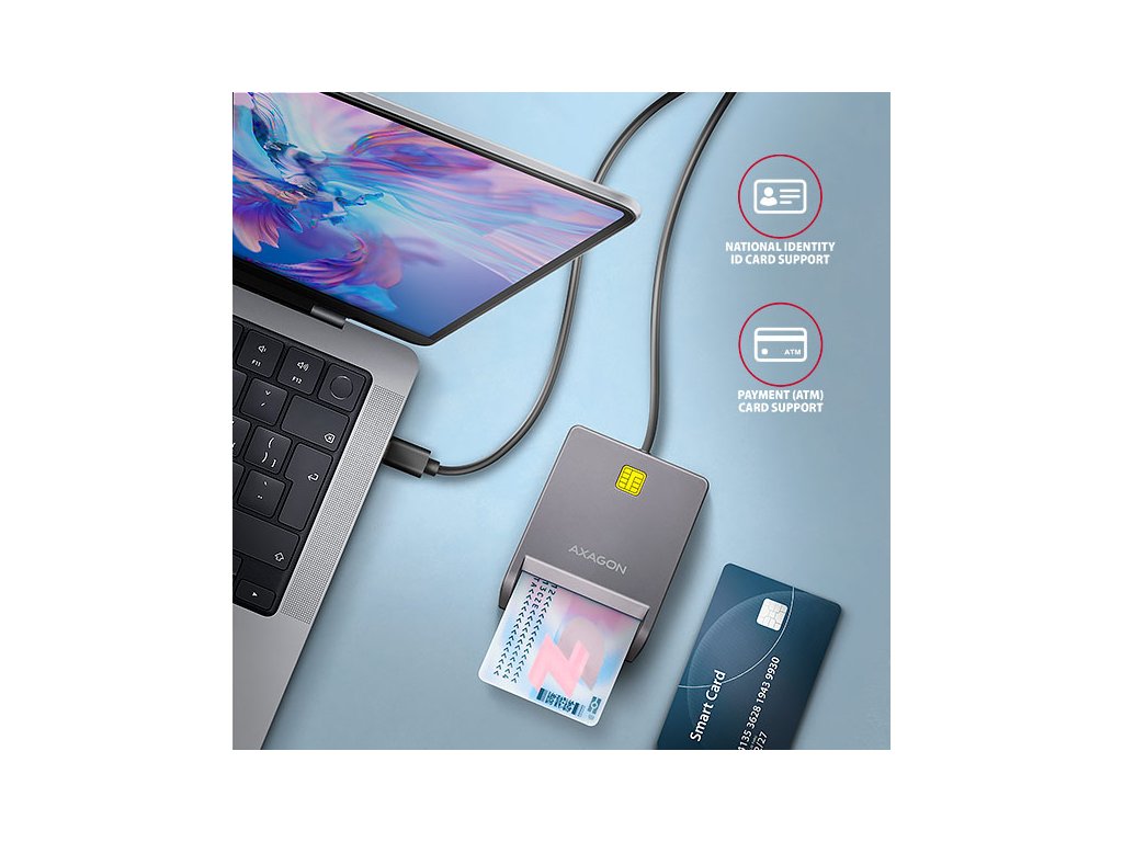 Kompaktní stolní čtečka Smart card / ID card AXAGON CRE-SM3TC FlatReader s USB 480 Mbps rozhraním. Je vhodná zejména jako čtečka občanských průkazů pro použití s mobilními telefony a počítači vybavenými USB-C vstupem. Oboustranný USB-C konektor zjednodušuje použití tím, že odstraňuje nutnost správného nasměrování konektoru při zapojení do telefonu nebo notebooku. Funkce Plug & Play umožňuje okamžité zprovoznění bez nutnosti instalace ovladačů. K dalšímu použití s vloženou kartou stačí nainstalovat vhodnou aplikaci. Čtečka je plně kompatibilní s aplikacemi eObčanka (CZ) a eID klient (SK). Card reader podporuje všechny běžné formáty kontaktních Smart karet, karet pro identifikační systémy a dalších čipových karet, včetně kontaktních bankovních platebních karet nebo kontaktních elektronických občanských průkazů *. Kompatibilita se všemi běžnými operačními systémy jako Windows, Linux, macOS a Android umožňuje široké využití jak na počítačích a noteboocích, tak na smartphonech a tabletech. Chytrá LED indikace svítí jen krátce po změně aktivity, poté zhasne, aby nerušila uživatele. Kompaktní design, kvalitní provedení, protiskluzová podložka a dostatečně dlouhý kabel zajišťují snadné a bezproblémové použití. Vstup: • USB 480Mbps (USB 2.0), protokol CCID. • Připojení k počítači přes USB 2.0 konektor typu C male. Čtečka karet: • slot podporuje karty ATM / CAC / ID / IC / SIS. • Podpora kontaktních Smart karet splňujících ISO 7816, třídy A, B a C (5V, 3V a 1.8V). • Podpora standardů ISO 7816, EMV 4.1 (EMV 2000 level 1). • Podporované protokoly T=0 and T=1, I2C, SLE 4432/42 (S=10), SLE 4418/28 (S=9). • Podpora PC Smart Card standardu PC/SC 2.0. • Podpora Microsoft Smart Card for Windows. • Podpora I2C karet SLE4418, SLE4428, SLE4432, SLE4442, SLE4436, SLE5536, SLE6636, AT88SC1608, AT45D041. • Vyhovuje Microsoft WHQL USB Smart Card Reader. • Vyhovuje požadavkům standardu FIPS 201. Další vlastnosti: • Kompatibilní s ovladačem Microsoft USB-CCID. • Podpora Plug and Play. • Podpora úsporného režimu, automatické přepnutí do úsporného režimu. • Napájení čtečky po USB sběrnici (bus-power). • LED indikující vložení karty (trvalým svitem) a přenos dat (blikáním). • Gumová podložka pro omezení samovolného pohybu po stole. • Rozměry 15 x 65 x 82 mm (V x Š x H), délka kabelu 1.2 m. • Hmotnost 51 g. Podporované operační systémy: • Windows 7 / 8.1 / 10 / 11 a novější, macOS, Linux a Android. • pro práci se Smart kartou je nutné nainstalovat do připojeného zařízení vhodnou aplikaci, např.: eObčanka (CZ) nebo eID klient (SK). Pozn.: Čtečka podporuje pouze kontaktní karty, které mají na povrchu viditelné kontakty. Karty bez kontaktů, známé jako RFID, nelze ve čtečce použít. Balení obsahuje: • USB čtečku Smart karet s kabelem napevno délky 1.2 m, • vícejazyčný návod CZ/DE/DK/ENG/ESP/FIN/FR/GR/HR/HU/IT/NL/PL/PT/RO/SK/SWE/TR/UA/BG/CN/ARA, • baleno v kartonové krabičce s otvorem pro zavěšení.Dodatočné parametre