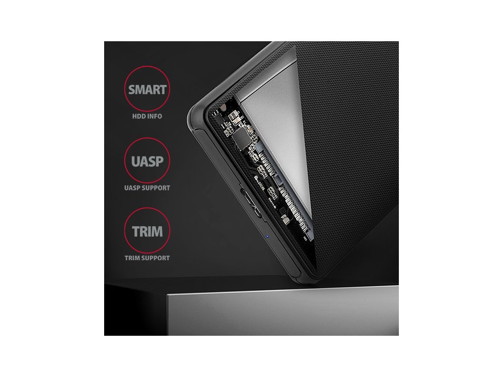 Lehký bezšroubkový externí AXAGON EE25-SL SLIDE BOX s USB 3.2 Gen 1 (USB 3.0) a SATA 6G rozhraním je určen pro všechny 2.5'' SATA pevné disky nebo SSD. SATA 6G rozhraní s podporou UASP dovolí užívat si rychlost moderních SSD disků. Podpora funkce TRIM pro omezení pozvolné degradace výkonu SSD v čase. Čtení S.M.A.R.T. informací monitorujících kondici externího disku. Podpora uspávání připojeného disku i boxu. Plastové tělo boxu umožňuje snadnou výměnu disku bez potřeby šroubování. Decentně vroubkovaný povrch krytu je odolný proti poškrábání a brání nežádoucím otiskům prstů. Pěnové výplně uvnitř boxu fixují a chrání vložený disk. Vstup: • USB 3.2 Gen 1 (USB 3.1 Gen 1 / USB 3.0) SuperSpeed USB s rychlostí až 5 Gbit/s. • Připojení přes micro USB type B female konektor. Podpora zařízení: • rozhraní SATA III - 6 Gb/s (600 MB/s), • podpora 2.5'' HDD/SSD, • max. kapacita disku - všechny bez omezení, • max. výška 2.5'' disku – 9.5 mm. Další vlastnosti: • Kompatibilní s USB 3.2 Gen 1 / USB 3.1 Gen 1 / USB 3.0, zpětně kompatibilní s USB 2.0. • Podpora přenosových rychlostí 5000 / 480 Mbit/s (SuperSpeed / HighSpeed). • Vyhovuje Serial ATA 3.0 specifikaci (SATA/600), přenosové rychlosti až 6 Gb/s (600 MB/s). • Vyhovuje Serial ATA 2.0 specifikaci (SATA/300), přenosové rychlosti až 3 Gb/s (300 MB/s). • Vyhovuje Serial ATA 1.0 specifikaci (SATA/150), přenosové rychlosti až 1.5 Gb/s (150 MB/s). • Celková propustnost / přenosová rychlost boxu je dána použitým USB rozhraním (teor. 5 Gbit/s). • Podpora UASP (USB Attached SCSI Protocol) a BOT (Bulk-Only Transport). • Podpora bootování z SSD/HDD v externím boxu. • Možnost připojení zařízení za chodu díky podpoře Hot Plug. • Plná podpora Plug and Play. • HDD Auto Spindown - automatické uspání disku při nečinnosti trvající 10 minut. • HDD Turn Off - vypnutí disku po odebrání zařízení nebo uspání PC. • Připojení přes USB 3.2 Gen 1 micro B female konektor. • Kabel micro USB-B / USB-A délky 52 cm součástí balení. • Decentní modrá LED indikující připojení k USB portu počítače (trvalým svitem) a přenos dat (blikáním). • Rozměry boxu 130 x 82 x 16 mm. • Hmotnost 63 g. Podporované operační systémy: • MS Windows XP / Vista / 7 / 8 / 8.1 / 10 a novější, Windows Server 2008 / 2012 / 2016 a novější (podporovány všechny 32- i 64-bitové verze OS Windows), Mac OS X 10.x a vyšší, Linux s jádrem 2.6.x a vyšším. Pozn.: Ovladače jsou součástí podporovaných operačních systémů a nainstalují se zcela automaticky. Žádné jiné ovladače není třeba instalovat a nejsou ani k dispozici. Balení v kartonové krabičce s otvorem pro zavěšení obsahuje: • USB 3.2 Gen 1 externí box pro 2.5'' SATA disk, • micro USB-B - USB-A kabel délky 52 cm, • multijazyčný manuál CZ/DE/DK/ENG/ESP/FIN/FR/GR/HR/HU/IT/NL/PL/PT/RO/RU/SK/SWE/BG/CN/TR/ARA.Dodatočné parametre