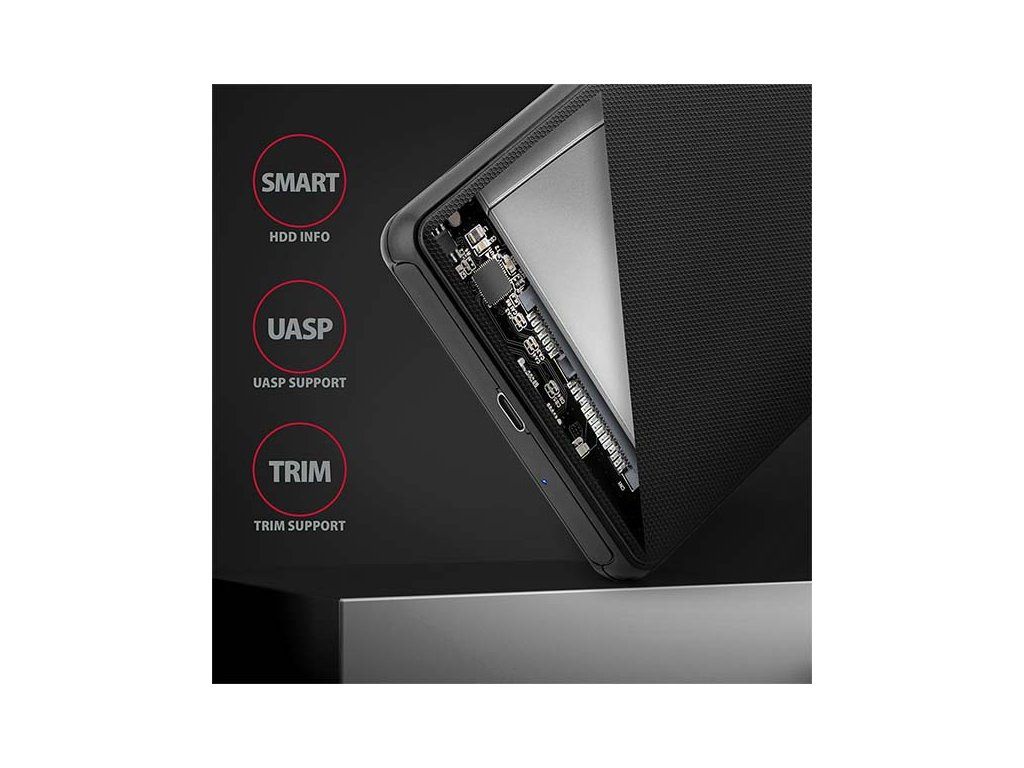 Lehký bezšroubkový externí AXAGON EE25-SLC SLIDE BOX s USB 3.2 Gen 1 (USB 3.0) a SATA 6G rozhraním je určen pro všechny 2.5'' SATA pevné disky nebo SSD. Spolehlivé a pohodlné připojení umožňuje oboustranný USB-C konektor. SATA 6G rozhraní s podporou UASP dovolí užívat si rychlost moderních SSD disků. Podpora funkce TRIM pro omezení pozvolné degradace výkonu SSD v čase. Čtení S.M.A.R.T. informací monitorujících kondici externího disku. Podpora uspávání připojeného disku i boxu. Plastové tělo boxu umožňuje snadnou výměnu disku bez potřeby šroubování. Decentně vroubkovaný povrch krytu je odolný proti poškrábání a brání nežádoucím otiskům prstů. Pěnové výplně uvnitř boxu fixují a chrání vložený disk. Vstup: • USB 3.2 Gen 1 (USB 3.1 Gen 1 / USB 3.0) SuperSpeed USB s rychlostí až 5 Gbit/s. • Připojení přes reverzibilní USB type C female konektor. Podpora zařízení: • rozhraní SATA III - 6 Gb/s (600 MB/s), • podpora 2.5'' HDD/SSD, • max. kapacita disku - všechny bez omezení, • max. výška 2.5'' disku - 9.5 mm. Další vlastnosti: • Kompatibilní s USB 3.2 Gen 1 / USB 3.1 Gen 1 / USB 3.0, zpětně kompatibilní s USB 2.0. • Podpora přenosových rychlostí 5000 / 480 Mbit/s (SuperSpeed / HighSpeed). • Vyhovuje Serial ATA 3.0 specifikaci (SATA/600), přenosové rychlosti až 6 Gb/s (600 MB/s). • Vyhovuje Serial ATA 2.0 specifikaci (SATA/300), přenosové rychlosti až 3 Gb/s (300 MB/s). • Vyhovuje Serial ATA 1.0 specifikaci (SATA/150), přenosové rychlosti až 1.5 Gb/s (150 MB/s). • Celková propustnost / přenosová rychlost boxu je dána použitým USB rozhraním (teor. 5 Gbit/s). • Podpora UASP (USB Attached SCSI Protocol) a BOT (Bulk-Only Transport). • Podpora bootování z SSD/HDD v externím boxu. • Možnost připojení zařízení za chodu díky podpoře Hot Plug. • Plná podpora Plug and Play. • HDD Auto Spindown - automatické uspání disku při nečinnosti trvající 10 minut. • HDD Turn Off - vypnutí disku po odebrání zařízení nebo uspání PC. • Připojení přes USB-C 3.2 Gen 1 female konektor. • Kabel USB-C / USB-A délky 32 cm součástí balení. • Decentní modrá LED indikující připojení k USB portu počítače (trvalým svitem) a přenos dat (blikáním). • Rozměry boxu 130 x 82 x 16 mm. • Hmotnost 63 g. Podporované operační systémy: • MS Windows XP / Vista / 7 / 8 / 8.1 / 10 a novější, Windows Server 2008 / 2012 / 2016 a novější (podporovány všechny 32- i 64-bitové verze OS Windows), Mac OS X 10.x a vyšší, Linux s jádrem 2.6.x a vyšším. Pozn.: Ovladače jsou součástí podporovaných operačních systémů a nainstalují se zcela automaticky. Žádné jiné ovladače není třeba instalovat a nejsou ani k dispozici. Balení v kartonové krabičce s otvorem pro zavěšení obsahuje: • USB-C 3.2 Gen 1 externí box pro 2.5'' SATA disk, • USB-C - USB-A kabel délky 32 cm, • multijazyčný manuál CZ/DE/DK/ENG/ESP/FIN/FR/GR/HR/HU/IT/NL/PL/PT/RO/RU/SK/SWE/BG/CN/TR/ARA.Dodatočné parametre