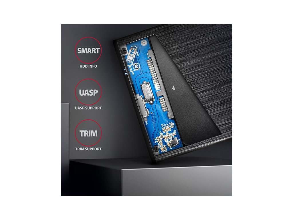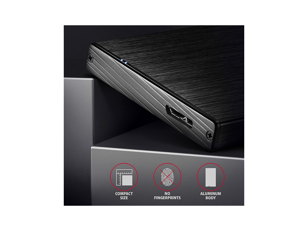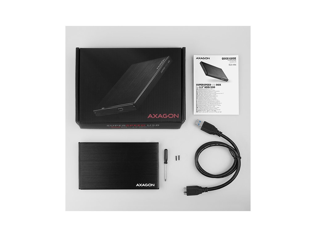 Kompaktní hliníkový externí box AXAGON EE25-XA6 ALINEbox s USB 3.2 Gen 1 (USB 3.0) rozhraním určený pro 2.5'' SATA pevné disky nebo SSD. SATA 6G rozhraní s podporou UASP dovolí užívat si rychlost moderních SSD disků. Podpora funkce TRIM pro omezení pozvolné degradace výkonu SSD v čase. Čtení S.M.A.R.T. informací monitorujících kondici externího disku. Podpora uspávání připojeného disku i boxu. Lehký a zároveň odolný odlitek hliníkové skříně pro dokonalou mechanickou ochranu disku a výborný odvod tepla. Decentně tvarovaná skříň s kartáčovaným povrchem zaručuje elegantní styl a brání nežádoucím otiskům prstů. Jednoduchou montáž pevného disku a automatickou instalaci zvládne i úplný laik a snadno tak vytvoří externí disk. Vstup: • USB 3.2 Gen 1 (USB 3.1 Gen 1 / USB 3.0) SuperSpeed USB s rychlostí až 5 Gbit/s. • Připojení přes micro USB type B female konektor. Podpora zařízení: • rozhraní SATA III - 6 Gb/s (600 MB/s), • podpora 2,5'' HDD/SSD disků. Vlastnosti: • Kompatibilní s USB 3.2 Gen 1 / USB 3.1 Gen 1 / USB 3.0, zpětně kompatibilní s USB 2.0. • Podpora přenosových rychlostí 5000 / 480 Mbit/s (SuperSpeed / HighSpeed). • Podpora 2.5'' SATA III/II/I disků výšky max. 9.5 mm všech kapacit bez omezení. • Vyhovuje Serial ATA 3.0 specifikaci (SATA/600), přenosové rychlosti až 6 Gb/s (600 MB/s). • Vyhovuje Serial ATA 2.0 specifikaci (SATA/300), přenosové rychlosti až 3 Gb/s (300 MB/s). • Vyhovuje Serial ATA 1.0 specifikaci (SATA/150), přenosové rychlosti až 1.5 Gb/s (150 MB/s). • Celková propustnost / přenosová rychlost boxu je dána použitým USB rozhraním (teor. 5 Gbit/s). • Podpora UASP (USB Attached SCSI Protocol). • Podpora bootování z SSD/HDD v externím boxu. • Možnost připojení zařízení za chodu díky podpoře Hot Plug. • Plná podpora Plug and Play. • HDD Auto Spindown - automatické uspání disku při nečinnosti trvající 10 minut. • HDD Turn Off - vypnutí disku po odebrání zařízení nebo uspání PC. • Připojení přes USB 3.2 Gen 1 micro B female konektor. • Kabel micro USB-B / USB-A délky 64 cm součástí balení. • Napájení po USB 3.2 Gen 1 sběrnici až 900mA z jednoho USB portu zcela dostačuje ve všech případech. • Decentní neoslňující modrá LED indikace připojení k USB portu počítače (trvalým svitem) a přenos dat (blikáním). • Velmi jednoduchá montáž disku - disk se připojí přímo do SATA konektoru základní desky, zasune do těla boxu a čelo se upevní dvěma šroubky přibaleným šroubovákem. Další údaje: • Kompaktní rozměry 130 x 78 x 12.5 mm. • Hmotnost externího boxu 75 g (bez USB kabelu a disku). Podporované operační systémy: MS Windows XP / Vista / 7 / 8 / 8.1 / 10 / 11 a novější, Windows Server 2003 / 2008 / 2012 / 2016 / 2019 a novější (podporovány všechny 32- i 64-bitové verze OS Windows), Mac OS X 10.x a vyšší, Linux s jádrem 2.6.x a vyšším. Pozn.: Ovladače jsou součástí podporovaných operačních systémů a nainstalují se zcela automaticky. Žádné jiné ovladače není třeba instalovat a nejsou ani k dispozici. Balení v kartónové krabičce obsahuje: • USB 3.2 Gen 1 externí box pro 2.5'' SATA disk, • micro USB-B - USB-A kabel délky 64 cm, • montážní šroubky a šroubovák, • tištěný multijazyčný manuál CZ/DE/DK/ENG/ESP/FIN/FR/GR/HR/HU/IT/NL/PL/PT/RO/RU/SK/SWE/BG/CN/TR/ARA.Dodatočné parametre