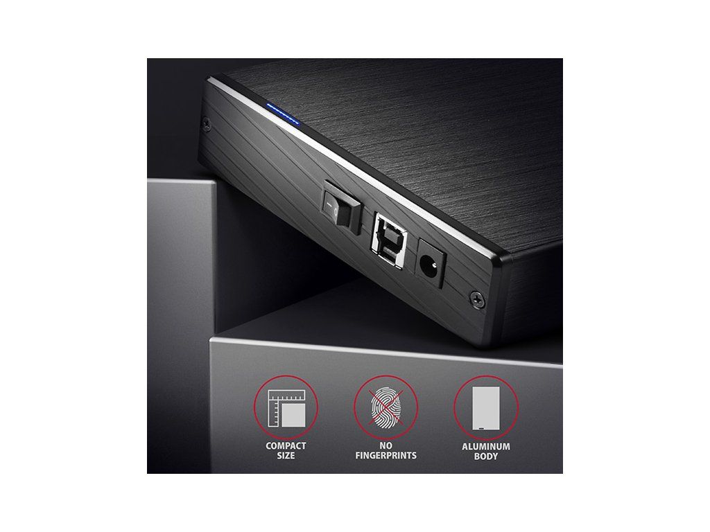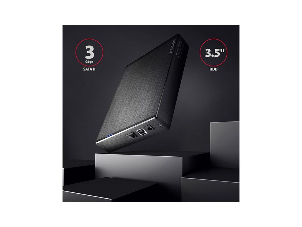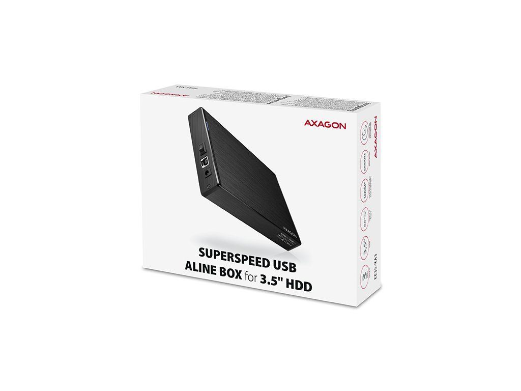 Kompaktní hliníkový externí box AXAGON EE35-XA3 ALINEbox s vysokorychlostním USB 3.2 Gen 1 (USB 3.0) rozhraním určený pro 3.5'' SATA disky. Podpora UASP dovolí užívat si nejvyšší možnou rychlost pevných disků. Čtení S.M.A.R.T. informací monitorujících kondici externího disku. Podpora uspávání připojeného disku i boxu. Odolný odlitek hliníkové skříně pro dokonalou mechanickou ochranu disku a výborný odvod tepla. Decentně tvarovaná skříň s kartáčovaným povrchem zaručuje elegantní styl a brání nežádoucím otiskům prstů. Jednoduchou montáž pevného disku a automatickou instalaci zvládne i úplný laik a snadno tak vytvoří externí disk. Vstup: • USB 3.2 Gen 1 (USB 3.1 Gen 1 / USB 3.0) SuperSpeed USB s rychlostí až 5 Gbit/s. • Připojení přes USB type B female konektor. Podpora zařízení: • rozhraní SATA II - 3 Gb/s (300 MB/s), • podpora 3,5“ HDD disků. Vlastnosti: • Kompatibilní s USB 3.2 Gen 1 / USB 3.1 Gen 1 / USB 3.0, zpětně kompatibilní s USB 2.0. • Podpora přenosových rychlostí 5000 / 480 Mbit/s (SuperSpeed / HighSpeed). • Podpora 3.5'' SATA III/II/I disků všech kapacit bez omezení. • Vyhovuje Serial ATA 2.0 specifikaci (SATA/300), přenosové rychlosti až 3 Gb/s (300 MB/s). • Vyhovuje Serial ATA 1.0 specifikaci (SATA/150), přenosové rychlosti až 1.5 Gb/s (150 MB/s). • Celková propustnost / přenosová rychlost boxu je dána použitým SATA/300 rozhraním (teor. 3 Gbit/s). • Podpora UASP (USB Attached SCSI Protocol). • Podpora bootování z HDD v externím boxu. • Možnost připojení zařízení za chodu díky podpoře Hot Plug. • Plná podpora Plug and Play. • HDD Auto Spindown - automatické uspání disku při nečinnosti trvající 10 minut. • HDD Turn Off - vypnutí disku po odebrání zařízení nebo uspání PC. • Připojení přes odolný velký USB 3.2 Gen 1 type B female konektor. • Kabel USB-B / USB-A délky 80 cm součástí balení. • Decentní modrá LED indikace připojení k USB portu počítače (trvalým svitem) a přenosu dat (blikáním). • Odolné tělo boxu je odlitek ze slitiny hliníku, čela boxu z plastu. • Jednoduchá montáž disku - na disk se nasadí vodicí lišty, disk se připojí přímo do SATA konektoru základní desky, zasune do těla boxu a čelo se upevní dvěma šroubky přibaleným šroubovákem. • Kompaktní rozměry boxu 180 x 120 x 32 mm. • Hmotnost externího boxu 244 g (bez kabelů a disku). Napájení: • Napájení přes kompaktní externí AC/DC adapter 12V - 2A (24W) s přívodním kabelem délky 150 cm. • Vypínač napájení na zadním panelu boxu. • Rozměry AC adaptéru 74 x 36 x 91 mm (vč. vidlice). • Hmotnost AC adaptéru 128 g (vč. přívodního kabelu). Podporované operační systémy: • MS Windows XP / Vista / 7 / 8 / 8.1 / 10 / 11 a novější, Windows Server 2003 / 2008 / 2012 / 2016 / 2019 a novější (podporovány všechny 32- i 64-bitové verze OS Windows), Mac OS X 10.x a vyšší, Linux s jádrem 2.6.x a vyšším. • Pozn.: Ovladače jsou součástí podporovaných operačních systémů a nainstalují se zcela automaticky. Žádné jiné ovladače není třeba instalovat a nejsou ani k dispozici. Balení v kartónové krabičce obsahuje: • USB 3.2 Gen 1 externí box pro 3.5“ SATA disk, • USB-B - USB-A kabel délky 80 cm, • napájecí adapter 100-240V / 12V-2A, • montážní lišty, šroubky a šroubovák, • stojánek umožňující provoz boxu nastojato, • tištěný multijazyčný manuál CZ/DE/DK/ENG/ESP/FIN/FR/GR/HR/HU/IT/NL/PL/PT/RO/RU/SK/SWE/BG/CN/TR/ARA.Dodatočné parametre