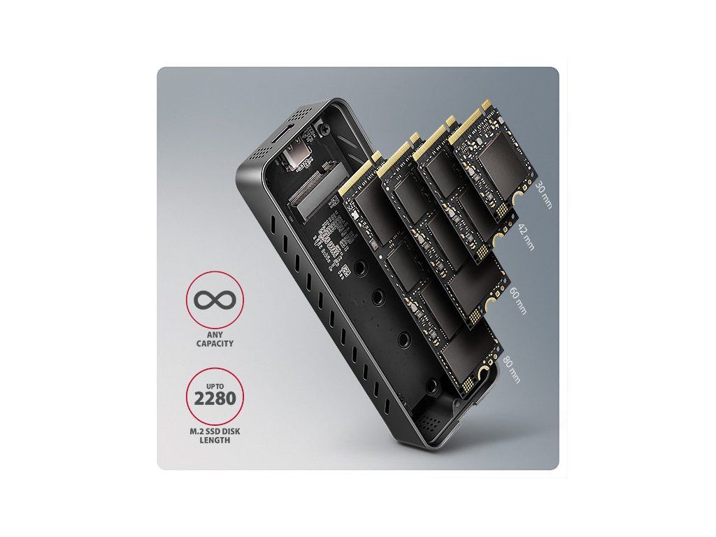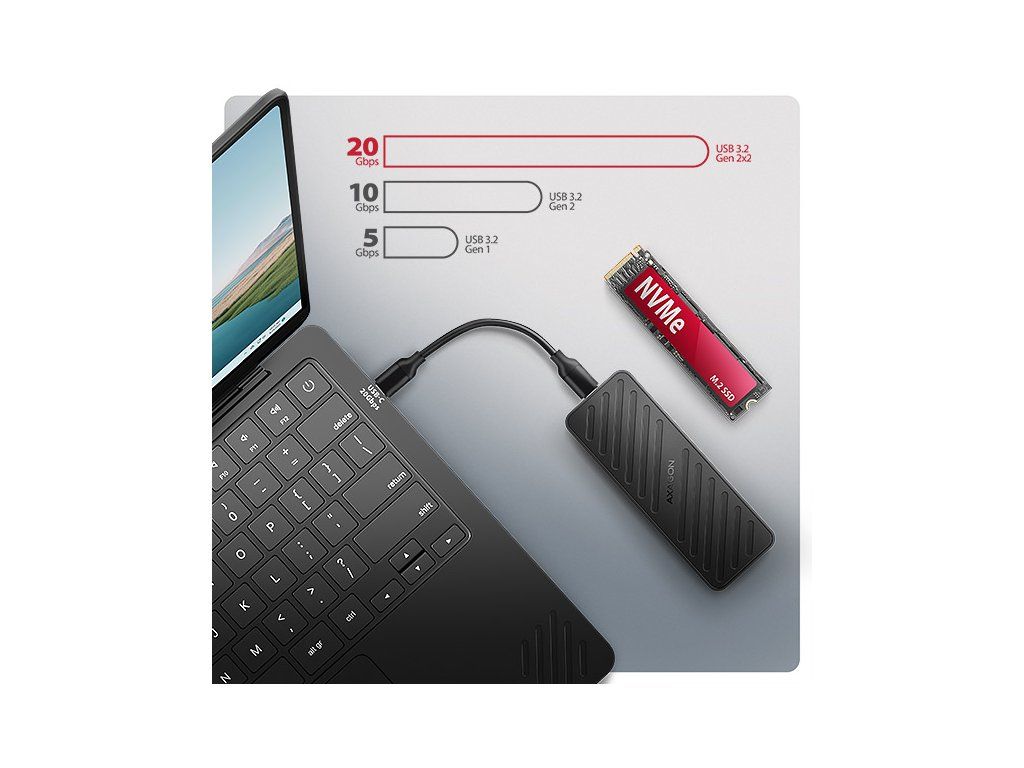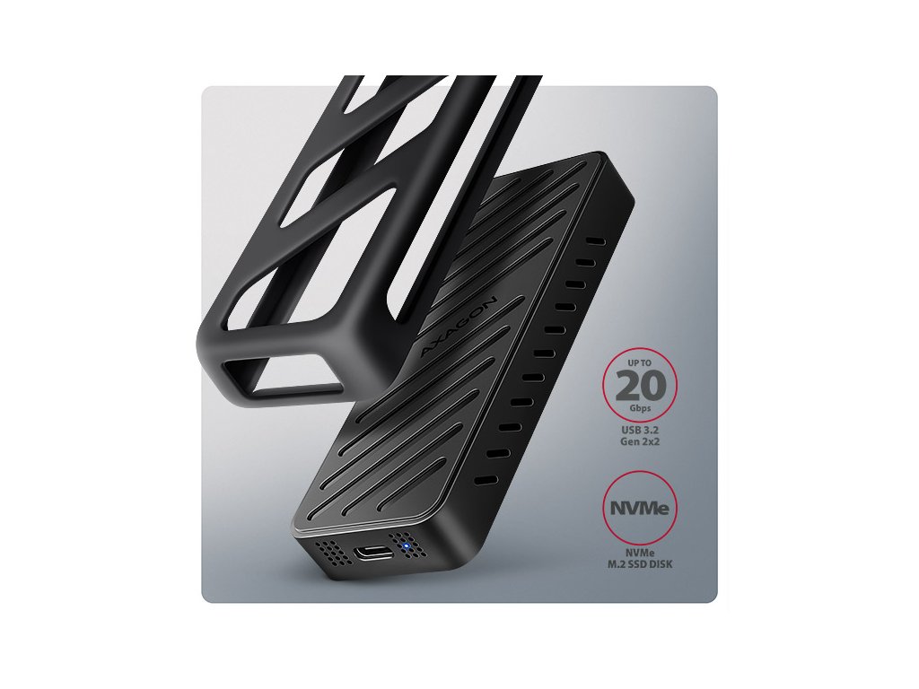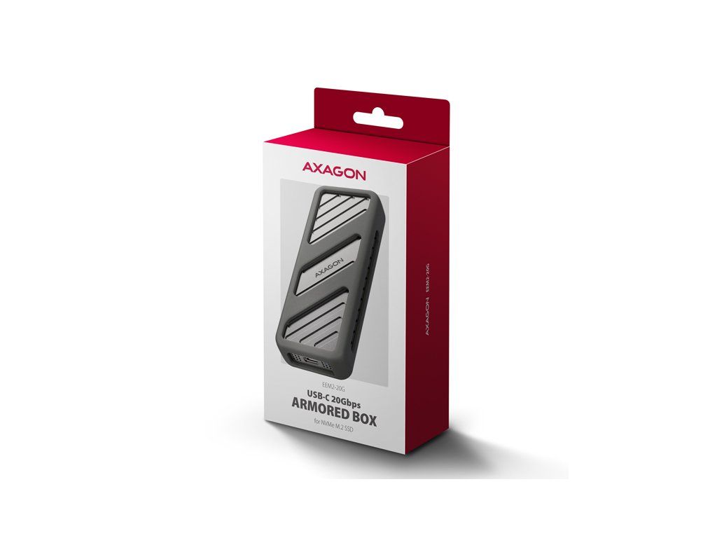 Rychlý externí AXAGON EEM2-20G ARMORED box s USB 20Gbps rozhraním určený pro M.2 NVMe SSD disky. Spolehlivé připojení umožňuje oboustranný USB-C konektor na boxu. V balení naleznete kabel USB-C -> USB-C pro připojení boxu k počítači. Díky USB 20Gbps rozhraní je přenosová rychlost až 20 Gb/s. Pro plné využití rychlosti boxu musí být řadič připojeného zařízení kompatibilní s USB 3.2 Gen 2x2. Tyto řadiče se obvykle používají v herních noteboocích a moderních stolních počítačích. Externí M.2 box podporuje i další moderní funkce např. UASP, TRIM a umožňuje čtení S.M.A.R.T. informací monitorujících stav disku. Podpora úsporného režimu při nečinnosti. Výhodou boxu je uchycení rovnou pro čtyři různé délky SSD disku - 30, 42, 60 a 80 mm. M.2 disky mohou být jednostranné nebo oboustranné. Box nemá omezení kapacity vloženého SSD disku. Otevírání boxu pomocí jediného šroubku usnadňuje montáž i demontáž M.2 SSD disku. Výměna disků je rychlá a snadná a rozšiřuje tak možnosti využití boxu např. pro migraci dat, testování atd. Hliníkové tělo boxu a teplovodivá podložka zajistí velmi dobré chlazení vloženého M.2 SSD disku. Průduchy na bočních stranách zajišťují dostatečnou cirkulaci vzduchu. Prodlužuje se tak jeho životnost a také je zamezeno zpomalování rychlosti disku tzv. „Thermal Throttling“. Dalším přínosem je silikonový návlek, který zajišťuje lepší ochranu boxu proti nárazům, zabraňuje klouzání po stole a zajišťuje pohodlné držení v ruce. Vnější kovový plášť je proveden v černé barvě s elegantním povrchem, který brání nežádoucím otiskům prstů. Vložením M.2 SSD disku do tohoto boxu snadno vytvoříte rychlý a univerzální externí disk. Box je možné použít jak s počítači a notebooky, tak s mobilními telefony a tablety. Vstup: • USB 20Gbps (USB 3.2 Gen 2x2), konektor USB-C female. • Kompatibilní s USB 5Gbps, USB 10Gbps. Podpora zařízení: • NVMe M.2 SSD disky, • určeno pro karty formátu M key nebo B+M key, • NGFF 75-pinový M key slot pro M.2 disky. Maximální teoretické podporované rychlosti a kompatibilita s USB řadiči (porty): • Notebook / PC s USB 20Gbps (USB 3.2 Gen 2x2) portem: max. rychlost 20 Gbit/s. • Notebook / PC s USB 10Gbps (USB 3.2 Gen 2) portem: max. rychlost 10 Gbit/s. • Notebook / PC s USB 5Gbps (USB 3.2 Gen 1 / USB 3.0) portem: max. rychlost 5 Gbit/s. • Kompatibilita s USB4, Thunderbolt 3/4 porty: max. rychlost 10 Gbit/s. • Reálná propustnost / přenosová rychlost boxu kolem 2000 MB/s (2 GB/s) je dána limity USB 3.2 Gen 2x2 rozhraní. Další vlastnosti: • Podpora přenosových rychlostí 20.000 / 10.000 / 5.000 Mbit/s. • Podpora M key nebo B+M key NVMe (PCI-Express) M.2 SSD disků bez omezení maximální kapacity. • Podpora M.2 disků rozměrů - 2230, 2242, 2260, 2280 mm. • Podpora jednostranných i oboustranných M.2 SSD disků. • Vyhovuje PCI Express Base Specification Revision 3.1a specifikaci. • Vyhovuje NVM Express 1.3c specifikaci. • Vyhovuje USB Mass Storage Class specifikaci. • Podpora BOT (Bulk-Only Transport). • Podpora UASP (USB Attached SCSI) pro rychlejší přenos dat ve Windows 8 a novějších. • Podpora funkce TRIM pro omezení pozvolné degradace výkonu SSD v čase. • Podpora S.M.A.R.T. (Self-Monitoring, Analysis, and Reporting Technology) systém monitorující stav disku. • Podpora bootování z SSD v externím boxu. • Možnost připojení zařízení za chodu díky podpoře Hot Plug. • Plná podpora Plug and Play. • Napájení po USB sběrnici až 900mA z jednoho USB portu zcela dostačuje ve všech případech. • Decentní modrá LED dioda indikující připojení k USB portu počítače (trvalým svitem) a přenos dat (blikáním). • Hliníkové odolné tělo a teplovodivá podložka napomáhají lepšímu chlazení M.2 SSD disku. • Vyšší povrchová teplota boxu není závadou - díky hliníkovému tělu je teplo generované provozem disku lépe odváděno a předáváno do okolí. • Připojení přes USB 3.2 Gen 2x2 type C female konektor. • Kabel USB type C male / USB type C male délky 38 cm je součástí balení. Další údaje: • Rozměry boxu 15 x 112 x 40 mm (V x Š x H). • Hmotnost boxu 83 g (bez kabelu, bez disku, bez návleku). Podporované operační systémy: • Windows 7 / 8.1 / 10 / 11 a novější, macOS, iPadOS, iOS, Linux, Chrome OS a Android. • Kompatibilita je závislá na aktualizovaném operačním systému a podpoře od výrobce zařízení. • Pozn.: Při použití s Windows 7 je nutné ověřit u výrobce M.2 SSD disku podporu tohoto OS a dostupnost ovladače. Balení v kartonové krabičce s otvorem pro zavěšení obsahuje: • USB-C 20Gbps externí box pro M.2 SSD, • silikonový návlek, • USB-C - USB-C kabel délky 38 cm, • 1ks teplovodivé podložky, • montážní materiál a šroubovák, • vícejazyčný návod CZ/DE/DK/ENG/ESP/FIN/FR/GR/HR/HU/IT/NL/PL/PT/RO/SK/SWE/TR/UA/BG/CN/ARA.Dodatočné parametre